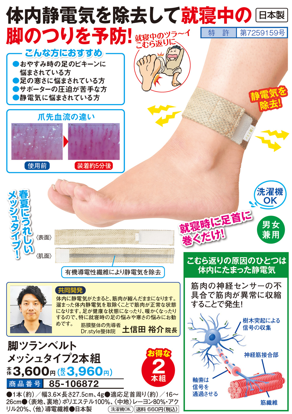体内静電気を除去して就寝中の脚のつりを予防! 就寝中のツラ~イこむら返りに 【こんな方におすすめ】 ●おやすみ時の足のピキーンに悩まされている方 ●足の寒さに悩まされている方 ●サポーターの圧迫が苦手な方 ●静電気に悩まされている方 就寝時に足首に巻くだけ! 春夏にうれしいメッシュタイプ! 有機導電性繊維により静電気を除去 【こむら返りの原因のひとつは体内にたまった静電気】 筋肉の神経センサーの不具合で筋肉が異常に収縮することで発生! 【共同開発】 体内に静電気がたまると、筋肉が縮んだままになります。溜まった体内静電気を取除くことで筋肉が正常な状態になります。 足が健康な状態になったり、暖かくなったりするので、特に就寝時の足の悩みや寒さの悩みにお勧めです。 筋膜整体の先導者 Dr.style整体院 土信田 裕介院長 ●お得な2枚組 ●男女兼用