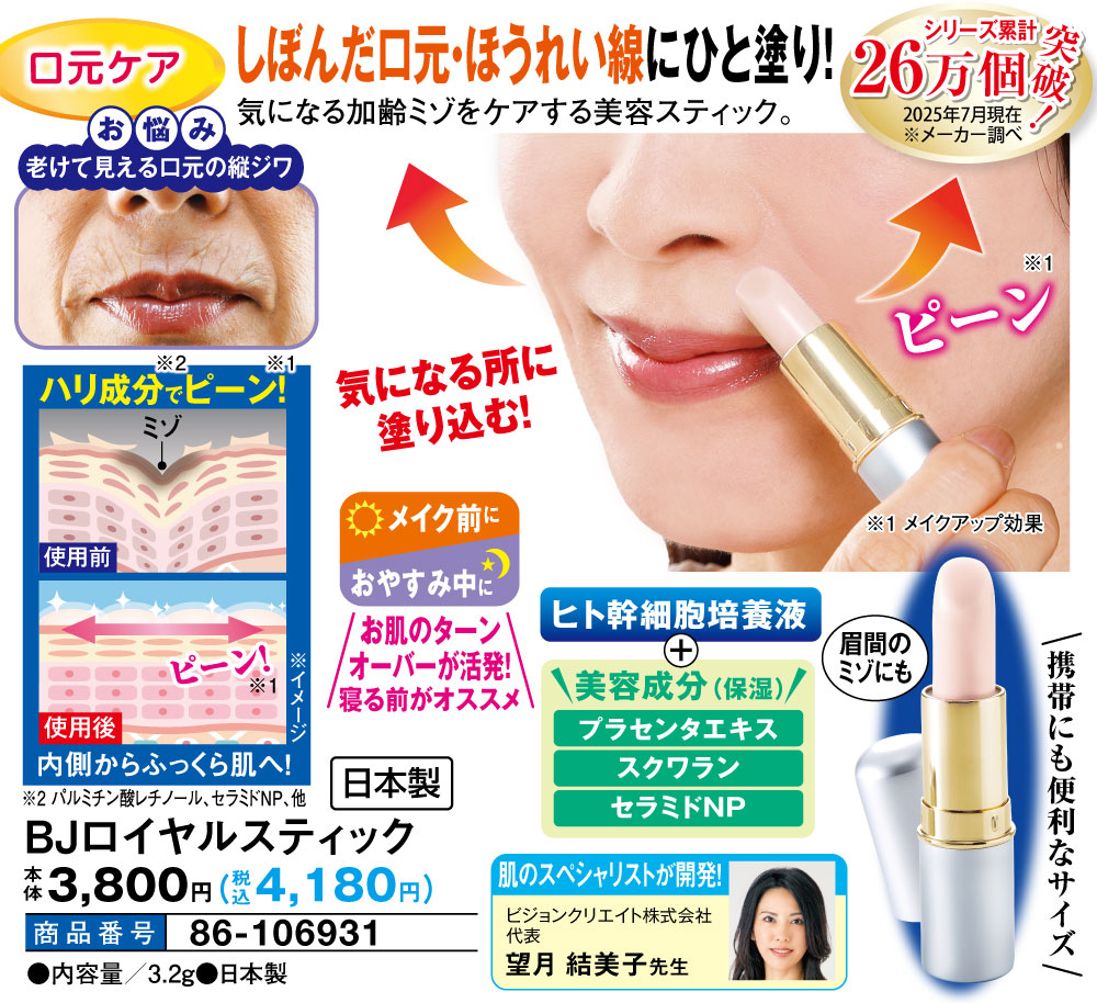 しぼんだ口元・ほうれい線にひと塗り! 気になる加齢ミゾをケアするヒト幹細胞培養液配合の美容スティック。 【お悩み】 老けて見える口元の縦ジワ 気になる所に塗り込む! メイク前に、おやすみ中に ハリ成分※2でピーンッ!内側からふっくら肌へ! 携帯にも便利なサイズ 【美容成分(保湿)】 プラセンタエキス・スクワラン・セラミドNP+ヒト幹細胞培養液 【肌のスペシャリストが開発!】 ビジョンクリエイト株式会社代表 望月 結美子先生