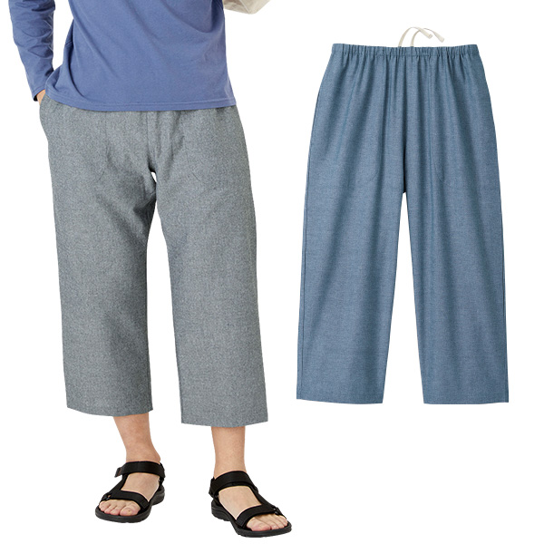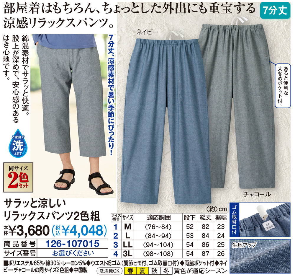 部屋着はもちろん、ちょっとした外出にも重宝する涼感リラックスパンツ! 綿混素材でサラッと快適。 股上が深めで、安心感のあるはき心地です。 7分丈、涼感素材で暑い季節にぴったり! あると便利な大きめポケット付。 ゴム取替口付 ●同サイズ2色セット ●7分丈