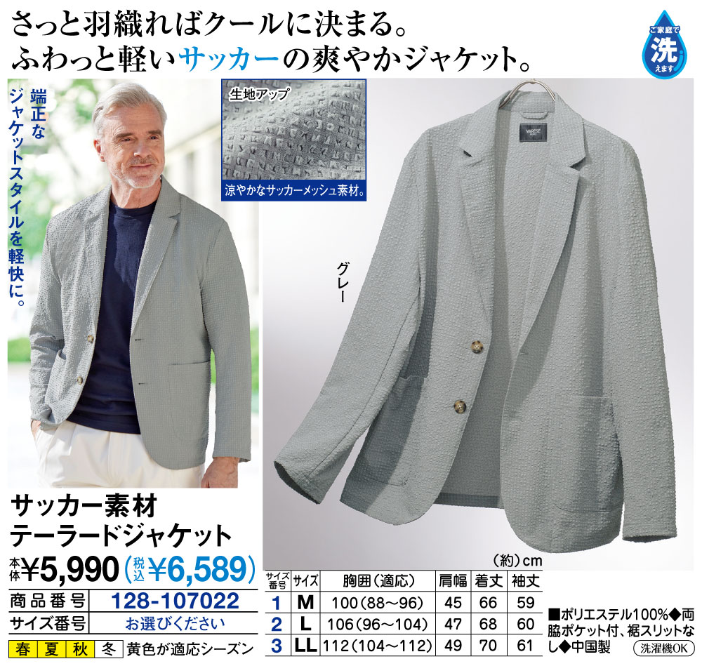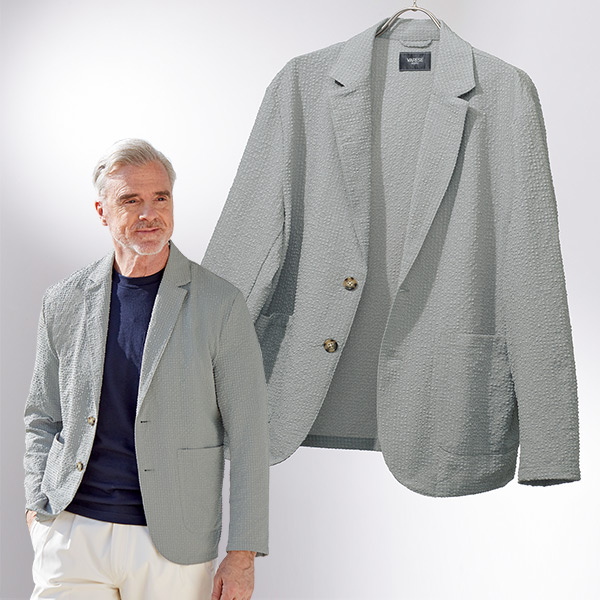 さっと羽織ればクールに決まる!ふわっと軽いサッカーメッシュの涼感ジャケット! 軽くて涼感があり、通気性に優れた素材で快適性とデザイン性を備えた多機能ジャケット。 端正なジャケットスタイルを軽快に。 涼やかなサッカーメッシュ素材。 ●長袖
