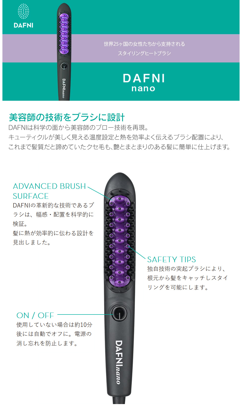 ブラッシングすることで美しくしなやかなストレートヘアへ 髪を挟まないので傷めにくく、研究しつくされた適温185℃により、うるおいをキープ! 1台でふんわりストレート、根元の立ち上げ、後頭部のボリュームアップなど様々なスタイリングを実現するブラシ型ヘアアイロンです。 科学的なアプローチによって美容師の技術をブラシで再現。 ブラシのように髪をとかすだけで、簡単に自然でツヤのある髪とスタイリングを目指します。
