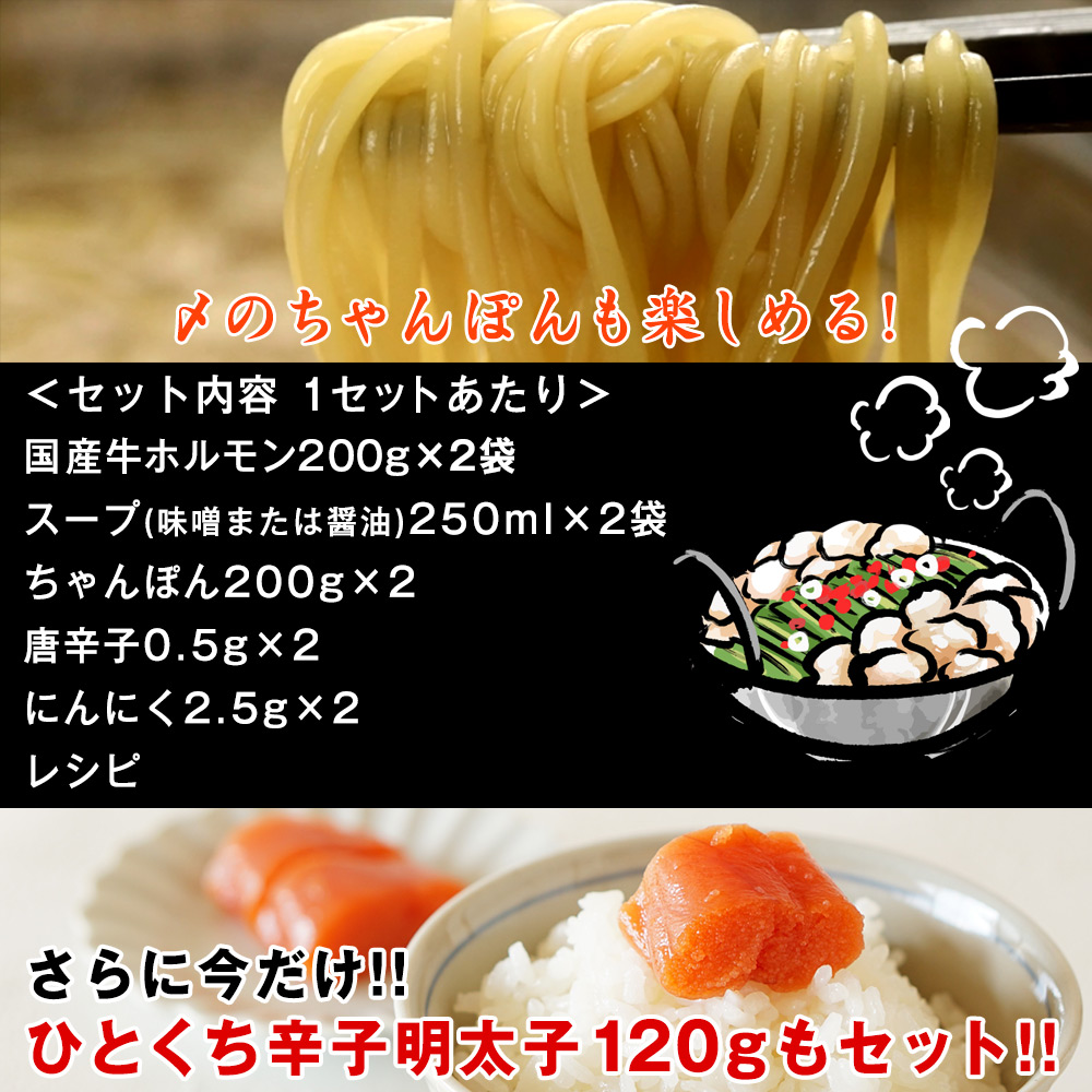 ●セット内容/ <味噌味>1セットあたり:国産牛ホルモン200g×2、味噌スープ250ml×2袋、ちゃんぽん200g×2、唐辛子0.5g×2、にんにく2.5g×2、ひとくち明太子120g×1、レシピ <醤油味>1セットあたり:国産牛ホルモン200g×2、醤油スープ250ml×2袋、ちゃんぽん200g×2、唐辛子0.8g×2、にんにく2.5g×2、ひとくち明太子120g×1、レシピ ●賞味期限/<味噌味・醤油味>製造日から冷凍180日 ●加工地/<味噌味・醤油味>日本<ひとくち明太子>日本 ●特定原材料/<味噌味・醤油味>卵・乳成分・小麦<ひとくち辛子明太子>小麦 ●特定原材料に準ずるもの/<味噌味・醤油味>牛肉・豚肉・鶏肉・大豆・ごま<ひとくち辛子明太子>大豆・ゼラチン