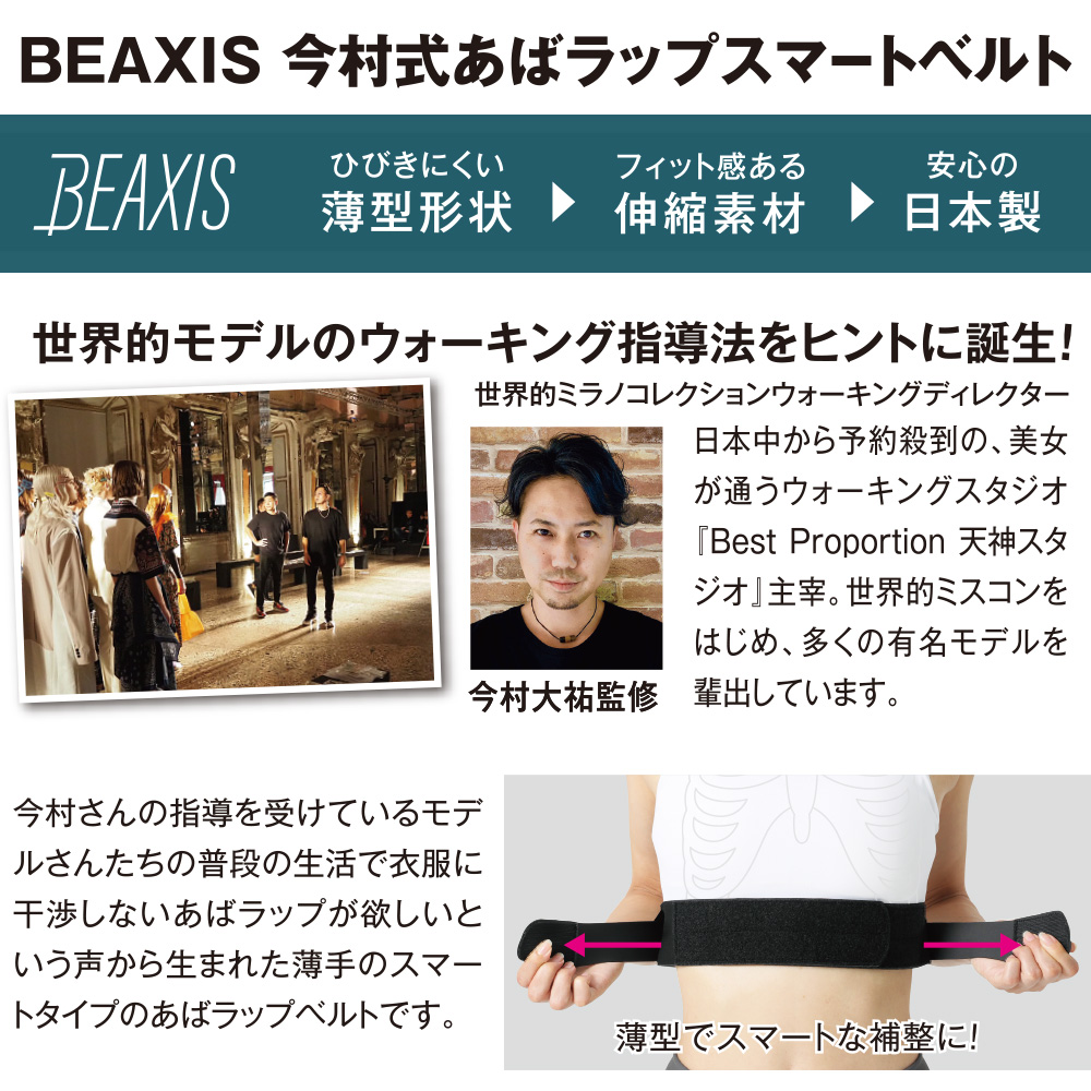 ボディライン補整!巻くだけ“あばら締め” 普段の生活でも、腹筋目覚めるプロの裏技! 世界的モデルのウォーキング指導法をヒントに誕生! ミラノコレクションウォーキングディレクター 今村大祐監修 レッスンでは、より美しい姿勢やボディラインを保つために「食品用ラップ」を巻いて、ウォーキングレッスンを行います。 そのプロの裏技を応用。 普段の生活で衣服に干渉しないあばラップが欲しいという声から生まれた薄手のスマートタイプのあばラップベルトです。 整った姿勢を保つことで、ボディラインも美しく。 普段の生活でも衣類に干渉しにくい超薄型フィット素材!