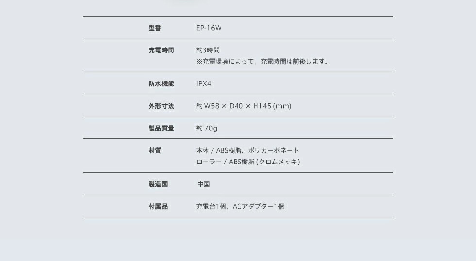 ■セット内容 本体、充電台、ACアダプター ■製品仕様 型番:EP-16W サイズ:約W58×D40×H145 (mm) 質量:約70g 充電時間:約3時間(※充電環境によって、充電時間は前後します。) 防水レベル:IPX4 製造国:中国