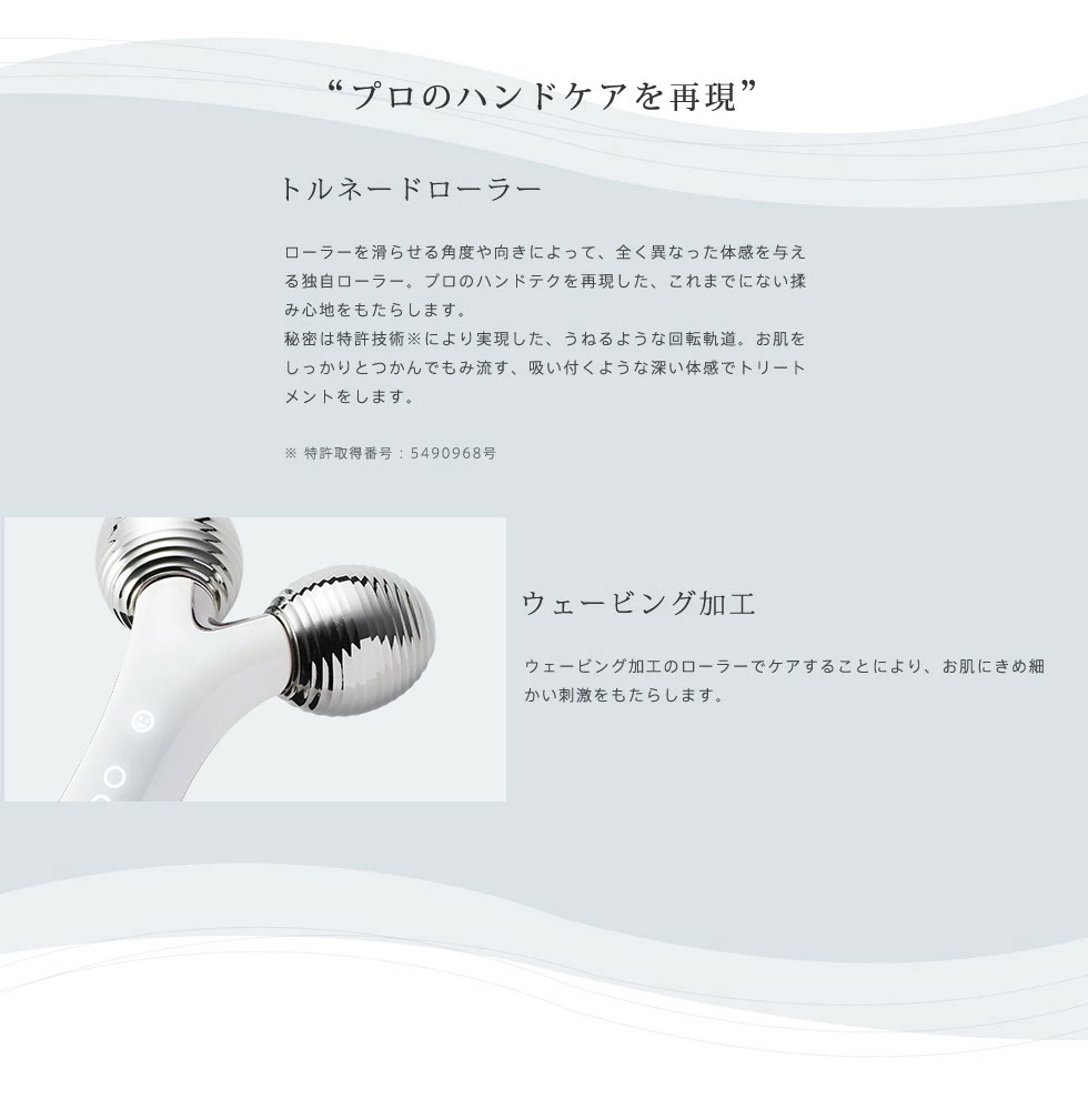 ◎毎日10分、気になる部分をコロコロするだけ! ◎目もと・フェイスライン・頬・口もとなどに! ◎プロのハンドテクを再現したトルネードローラー。 ◎EMS+マイクロカレントで、深層筋肉を刺激! ◎防水仕様(IPX4)。 ◎オートオフ機能があり、約10分で自動的にオフ。