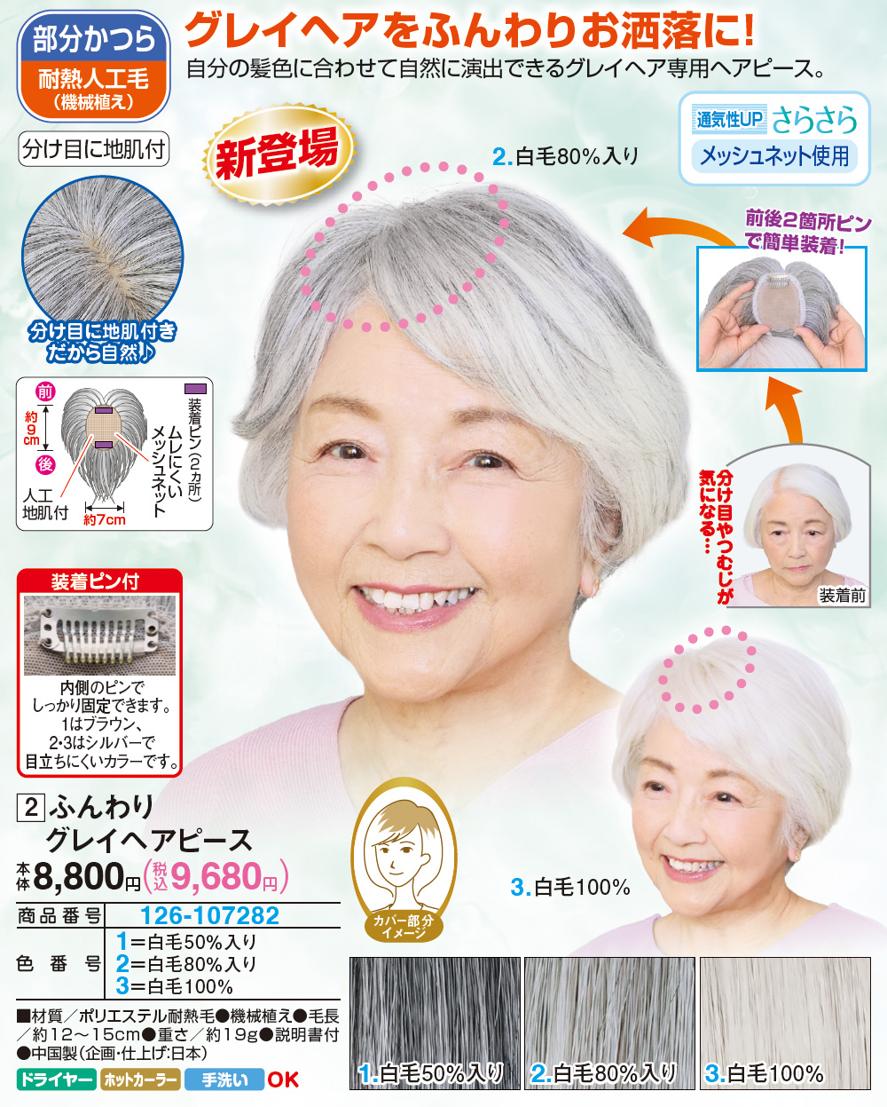 自分の髪色に合わせて自然に演出できるグレイヘア専用ヘアピース。