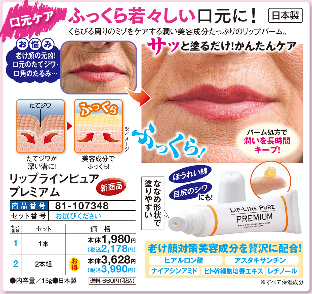 ふっくら若々しい口元に! くちびる周りのミゾをケアする潤い美容成分たっぷりのリップバーム。 【お悩み】 老け顔の元凶!口元のたてジワ・口角のたるみ・・・ サッと塗るだけ!かんたんケア バーム処方で潤いを長時間キープ! たてジワが深い溝に!→美容成分でふっくら! ほうれい線、目尻のシワにも! ななめ形状で塗りやすい 【老け顔対策美容成分を贅沢に配合!】 ・ヒアルロン酸 ・アスタキサンチン ・ナイアシンアミド ・ヒト幹細胞培養エキス ・レチノール ※すべて保湿成分