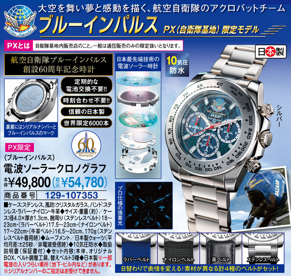 日替わりで表情を変える! 合計4本のベルトがセット!! ラバーベルト/ナイロンベルト/革ベルト/ステンレスベルト 日本の最先端技術を詰め込んだ電波ソーラー時計 裏蓋にはシリアルナンバーとブルーインパルスのマーク プロ仕様の強蓄光 【PXとは】 自衛隊基地内販売店(PX)限定販売商品なので、一般販売は通信販売のみの扱いとなります。 電池交換不要! 時刻合わせ不要! 信頼の日本製! 世界限定6000本!