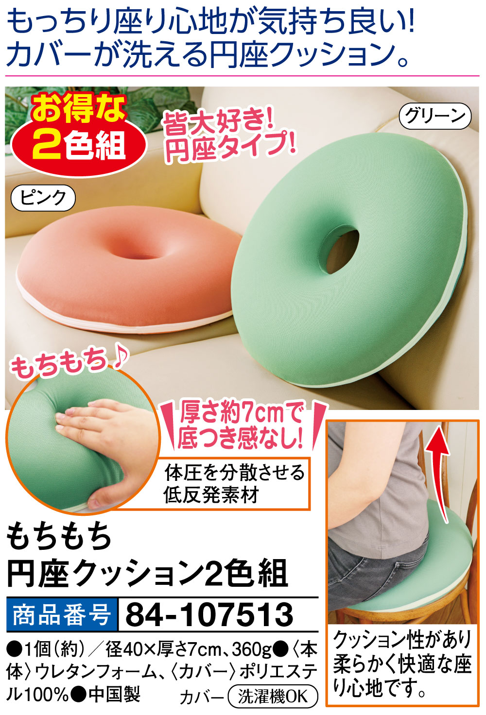 もっちり座り心地が気持ち良い!カバーが洗える円座クッション! 皆大好き!円座タイプ! \厚さ約7cmで底付き感なし!/ 体圧を分散させる低反発素材 クッション性があり柔らかく快適な座り心地です! ●お得な2色組