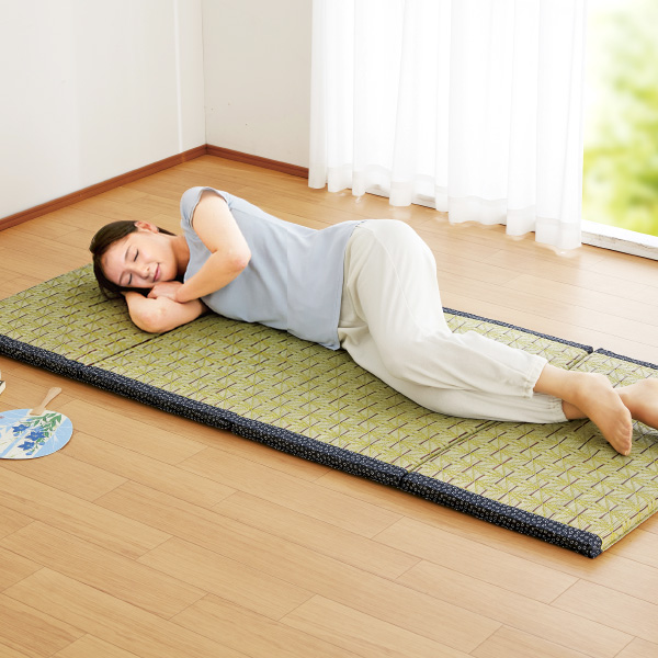 ウレタン入りで寝心地抜群!ベタつく夏も安心のい草マット! 【天然い草】 ●湿度を調節 高い吸湿性があり、乾燥時には水分を放出。 ●消臭効果 表面の汗の臭いやペット臭などをセーブ。 ●吸汗機能 綿抗菌の約3倍ともいわれる吸汗性でいつでも爽やか。 ●抗菌機能 い草が本来もつ抗菌機能。 【江戸桜】 落ち着いた紺色に小桜をちりばめた粋な柄。 【麻の葉】 手間をあまりかけなくても育つこと、邪気をはらうことから、赤ちゃんの産着や着物の模様として広く用いられています。 心地良いシャリ感 4つ折りできて収納に便利、サッと広げるだけ たたんで座椅子としても使えます ●抗菌 ●厚さ約3cm
