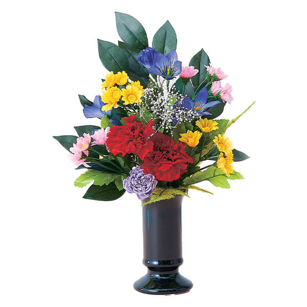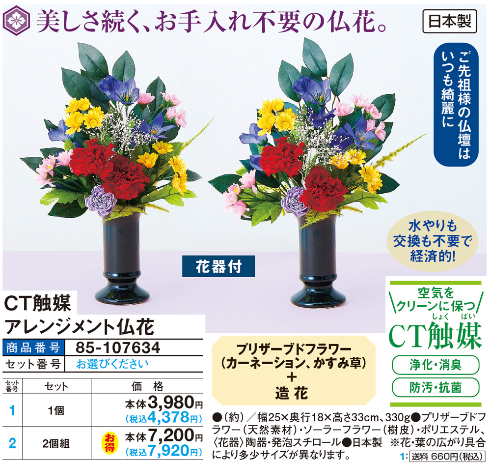 美しさ続く、お手入れ不要の仏花! ご先祖様の仏壇はいつも綺麗に 水やりも交換も不要で経済的! プリザーブドフラワー(カーネーション、かすみ草)+造花 ●花器付 空気をクリーンに保つCT触媒 ●浄化・消臭 ●防汚・抗菌