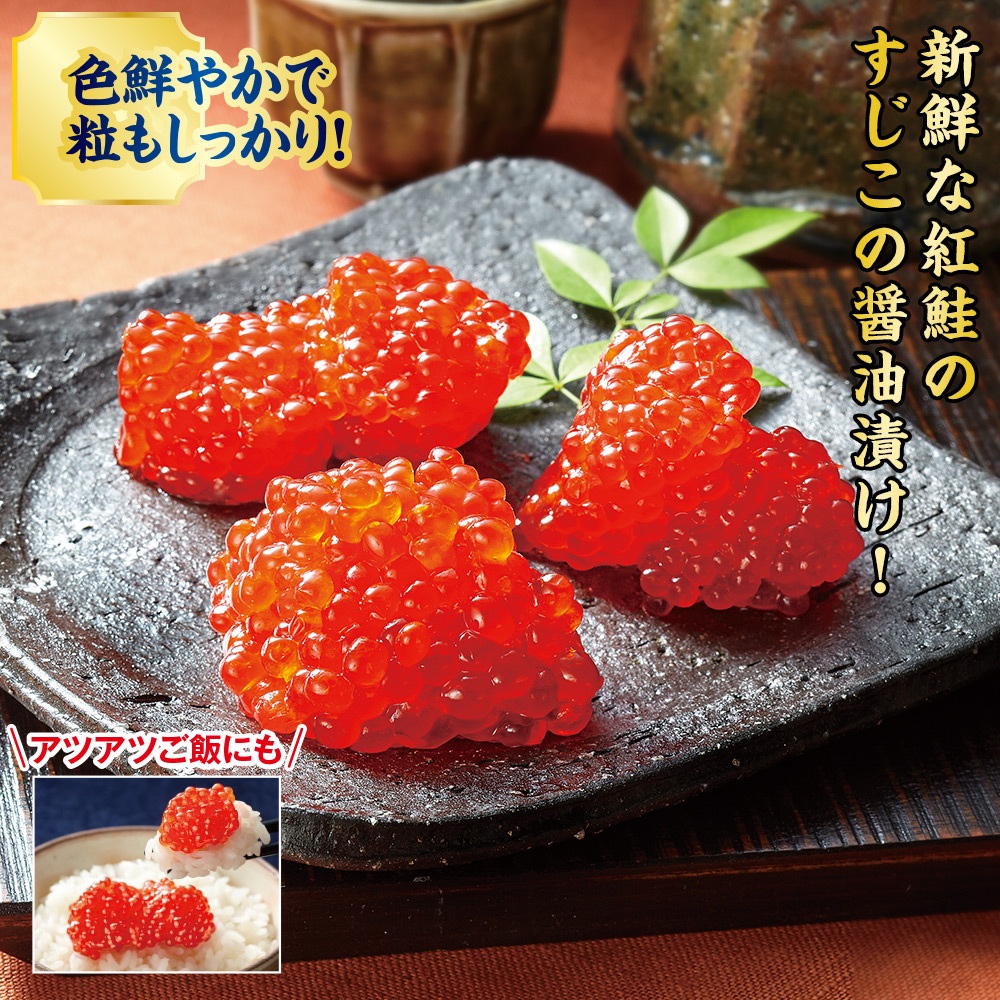 色鮮やかで粒もしっかり! アツアツご飯にも。 脂がのった紅鮭の卵を新鮮なまま醤油漬けにし、急速冷凍しました。 色鮮やかな紅色で粒もしっかり、卵の旨みが濃厚な一品です。