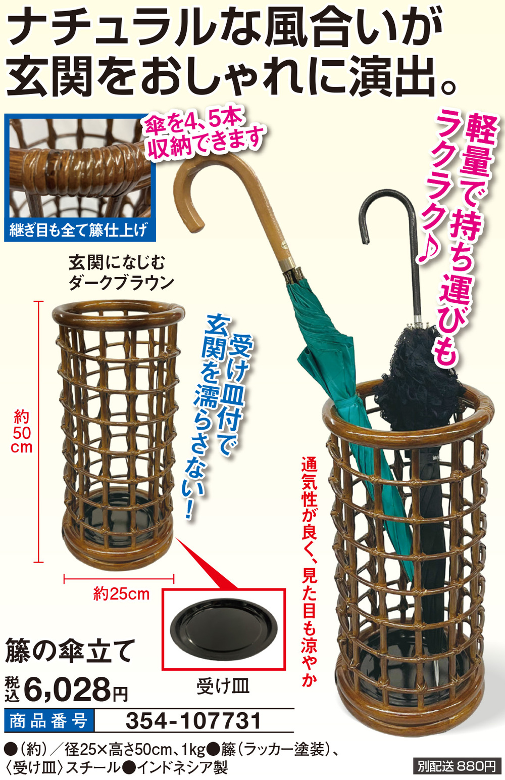 ●軽量で持ち運びもラクラク♪ ●傘を4、5本収納できます ●受け皿付で玄関を濡らさない! ●通気性が良く、見た目も涼やか ●継ぎ目も全て籐仕上げ ●玄関になじむダークブラウン