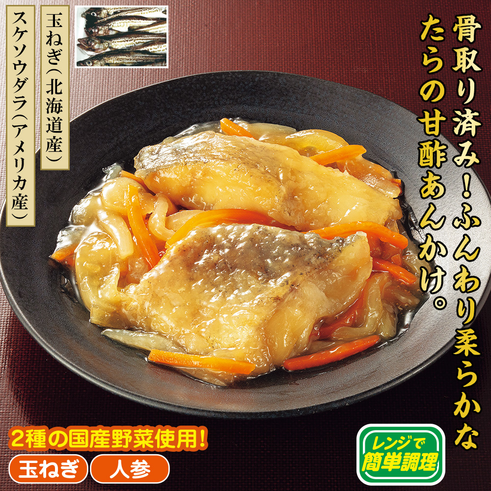 【スケソウダラ(アメリカ産)】【玉ねぎ(北海道産)】 骨を丁寧に取り除いたすけそうだらを、軽く粉付けし焼いた後玉ねぎと人参と合わせ、甘酢のあんで煮つけました。 2種の国産野菜使用! 玉ねぎ・人参。 レンジで簡単調理。 食べやすい個包装。