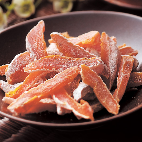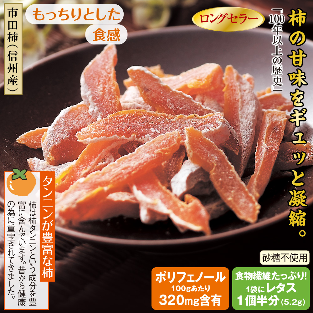 【市田柿(信州産)】 信州伊那地方産の「市田柿」を和風のドライフルーツとも言われる干し柿にして甘味を凝縮し、食べやすくカットしました。 もっちりとした食感に、天然糖分の上品な甘さをぜひご堪能ください。 タンニンが豊富な柿 柿は柿タンニンという成分を豊富に含んでいます。 昔から健康の為に重宝されてきました。 砂糖不使用 ポリフェノール100gあたり320mg含有 食物繊維たっぷり!1袋にレタス1個半分(5.2g)