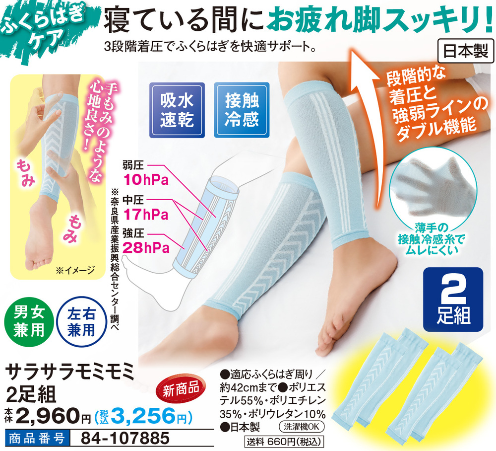 寝ている間にお疲れ脚スッキリ! 3段階着圧でふくらはぎを快適サポート。 段階的な着圧と強弱ラインのダブル機能 薄手の接触冷感糸でムレにくい 手もみのようなもみ心地良さ! ●吸水速乾 ●接触冷感 ●男女兼用 ●左右兼用 ●ふくらはぎケア