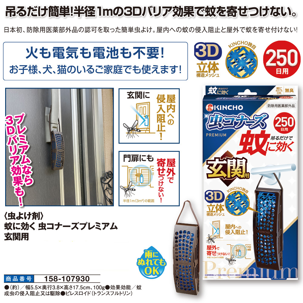 日本初、防除用医薬部外品の認可を取った簡単虫よけ。 屋内への蚊の侵入阻止と屋外で蚊を寄せ付けない! プレミアムなら3Dバリア効果も! 屋内への侵入阻止! 屋外で寄せ付けない! ◎250日用
