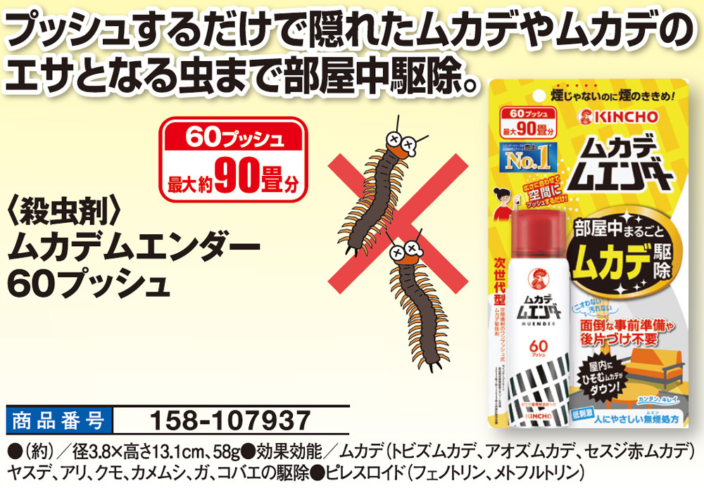 ●(約)/径3.8×高さ13.1cm、58g ●効果効能/ムカデ(トビズムカデ、アオズムカデ、セスジ赤ムカデ)ヤスデ、アリ、クモ、カメムシ、ガ、コバエの駆除 ●ピレスロイド(フェノトリン、メトフルトリン)