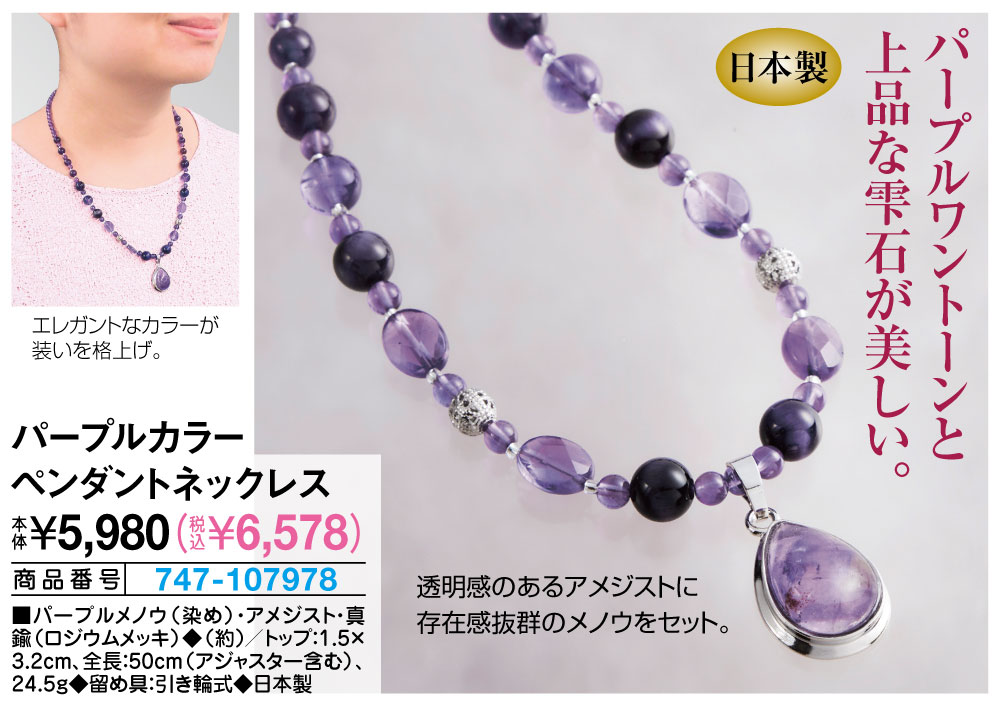 ■パープルメノウ(染め)・アメジスト・真鍮(ロジウムメッキ) ◆(約)/トップ:1.5×3.2cm、全長:50cm(アジャスター含む)、24.5g ◆留め具:引き輪式 ◆日本製