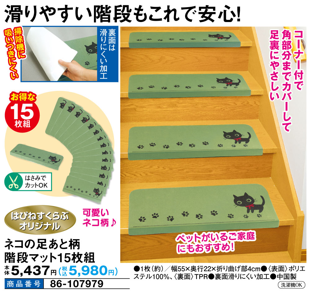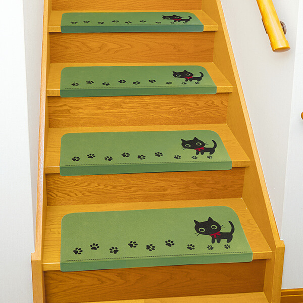 滑りやすい階段もこれで安心! 可愛いネコ柄! コーナー付で角部分までカバーして足裏にやさしい ペットがいるご家庭にもおすすめ! 裏面は滑りにくい加工 掃除機に吸いつきにくい ●お得な15枚組 ●はさみでカットOK