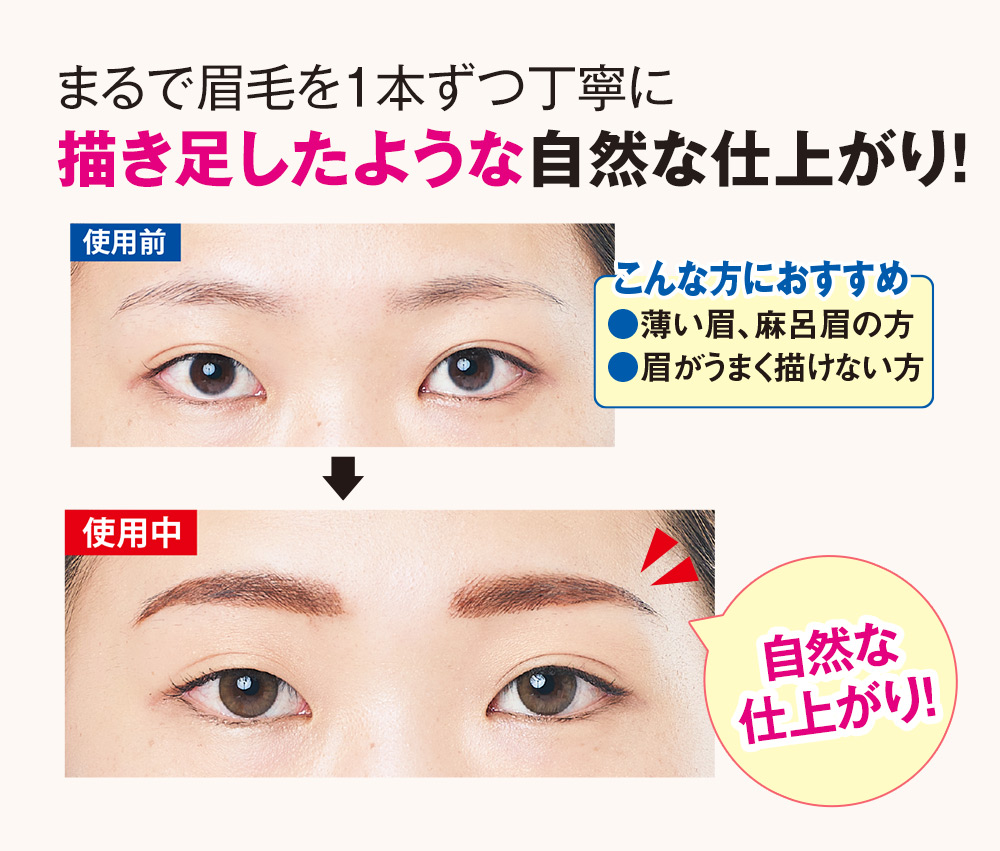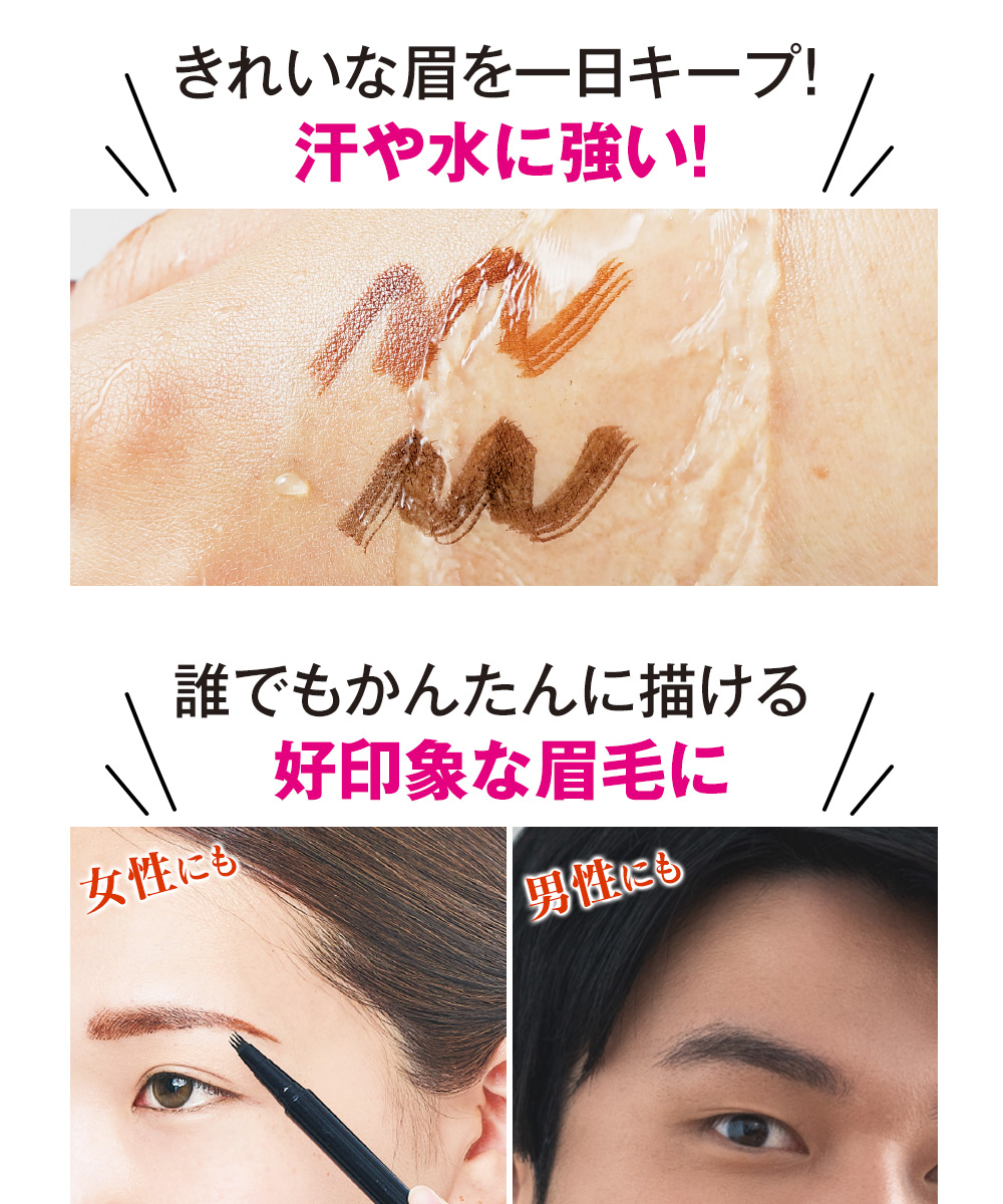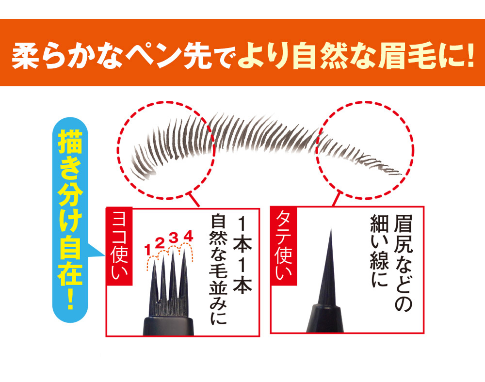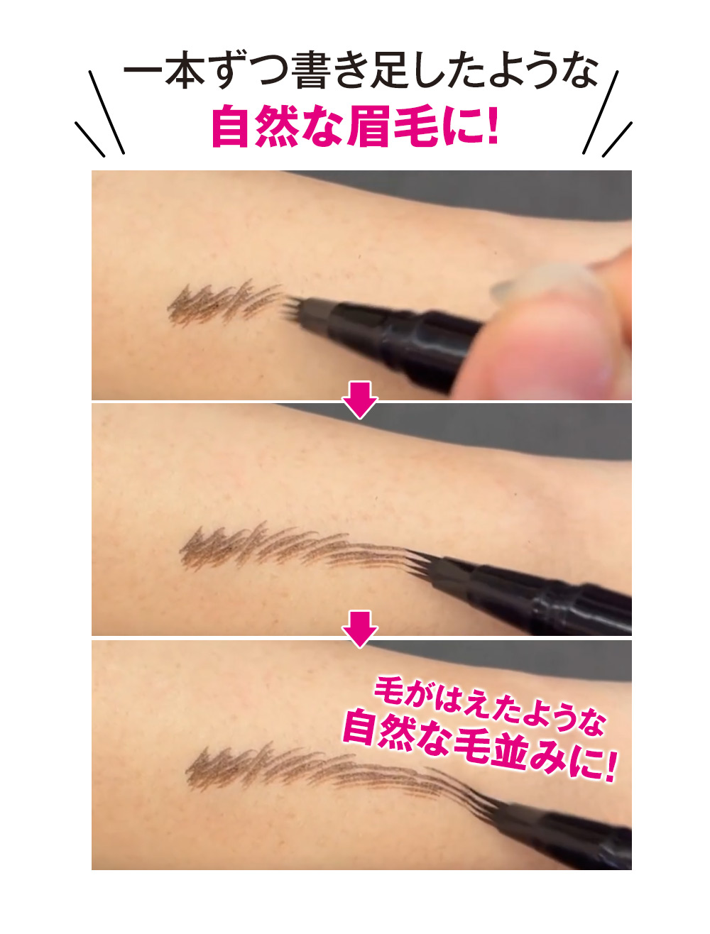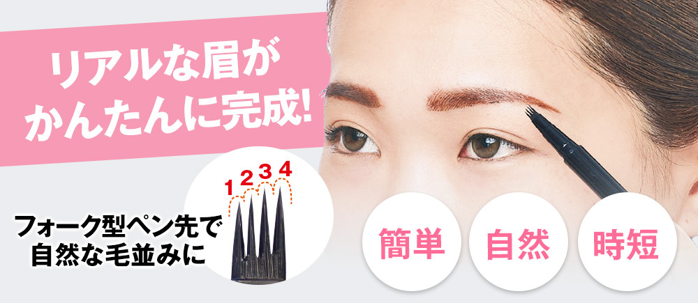 リアルな眉毛が素早く簡単に! ペン先が4つに分かれたフォーク型のリキッドアイブロウ。 まるで眉毛を1本ずつ丁寧に描き足したような自然な仕上がり! 柔らかなペン先でより自然な眉毛に! 描き分け自在! ヨコ使い:1本1本自然な毛並みに タテ使い:眉尻などの細い線に 【美容保湿成分配合】 シャクヤク根エキス、パイナップル果実エキス 【こんな方におすすめ】 ・薄い眉、麻呂眉の方 ・眉がうまく描けない方 男性にもおすすめ! ●汗や水に強い ●アイブロウ