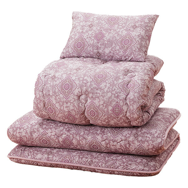 ●<掛け布団、敷き布団>側地:ポリエステル100%、詰め物:ポリエステルわた100%(抗菌防臭わた「マイティトップRII ad ECO」50%使用)・ポリエステル固わた(敷き布団のみ)、<枕>側地:ポリエステル100%、詰め物:ポリエステルわた100%