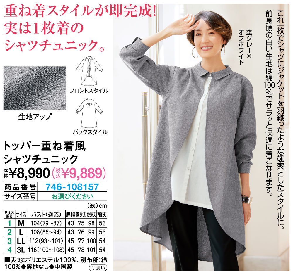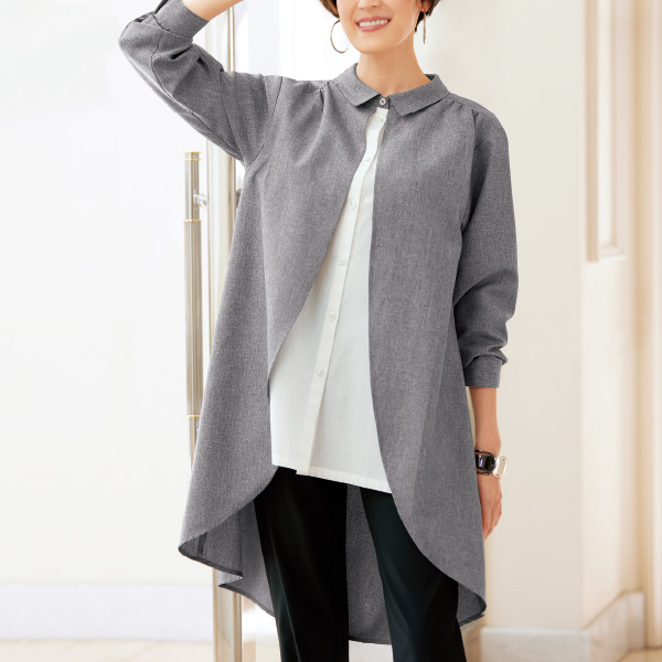 これ一枚着るだけで、白シャツにロングジャケットを羽織ったような重ね着スタイルが楽しめます。
