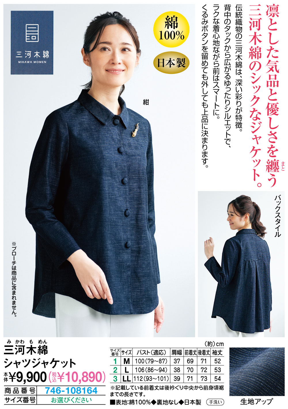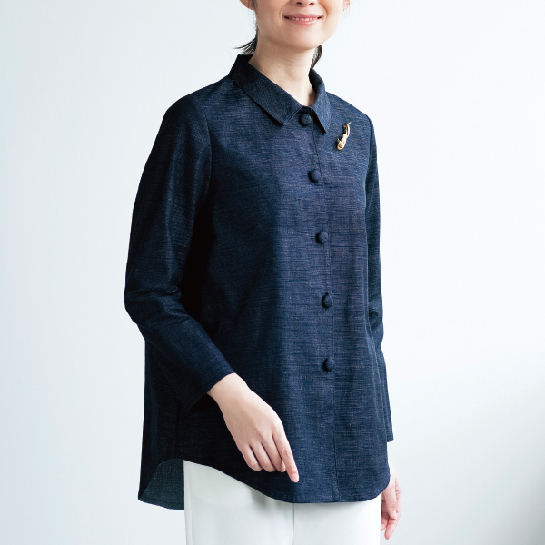 伝統織物、三河木綿は、いくつもの色を重ねた深い彩りが特徴。 背中のタックが広がるゆったりシルエットながら前はスマートで、くるみボタンを開けても閉めても上品に決まります。