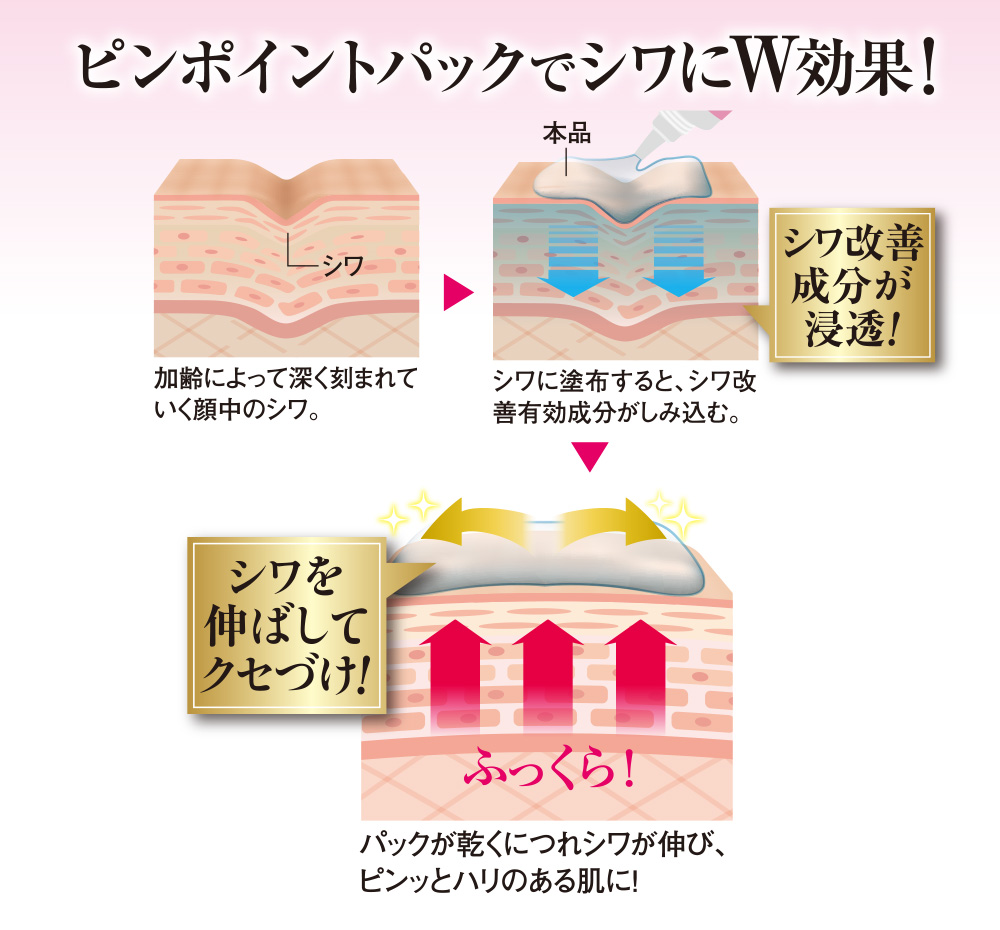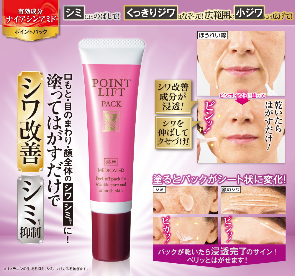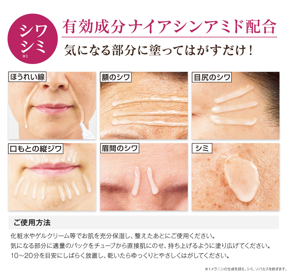 塗ってはがすだけでシワ改善! 有効成分ナイアシンアミド配合のシワ改善パック。 目元・口元やおでこなど顔全体のシワは老け顔の原因! 額・眉間のシワ、ほうれい線 ピンポイントに塗って…乾いたらはがすだけ! ピンッ! シワ改善・美白(※1)有効成分 ナイアシンアミド (ビタミンPP)配合 \リフト&ハリツヤサポート成分贅沢配合!/ ●キトフェルマー:被膜で肌をストレッチ ●ヒアルバルーン:潤いを抱えてふくらむ ●スプリングミント:ふっくらとしたハリ肌へ ●医薬部外品 【有効成分】 ナイアシンアミド 【効能・効果】 シワを改善する。肌あれ。あれ性。メラニンの生成を抑え、しみ、そばかすを防ぐ(※1)。肌をなめらかにする。 【ピンポイントパックでシワにW効果!】 シワに塗布すると、シワ改善有効成分がしみ込む。 パックが乾くにつれシワが伸び、ピンッとハリのある肌に! 無香料・無着色・無鉱物油・パラペンフリー ●シワケア