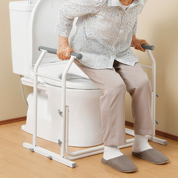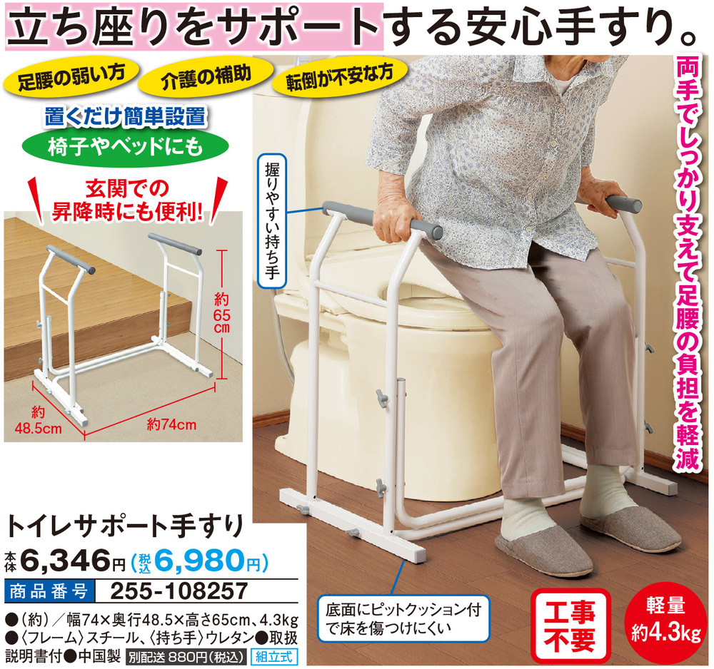 置くだけで立ち座りをサポートする安心手すり! 握りやすい持ち手 両手でしっかり支えて足腰の負担を軽減 底面にピットクッション付で床を傷つけにくい 置くだけ簡単設置 椅子やベッドの立ち座りにも ●足腰の弱い方 ●介護の補助 ●工事不要 ●軽量約4.3kg