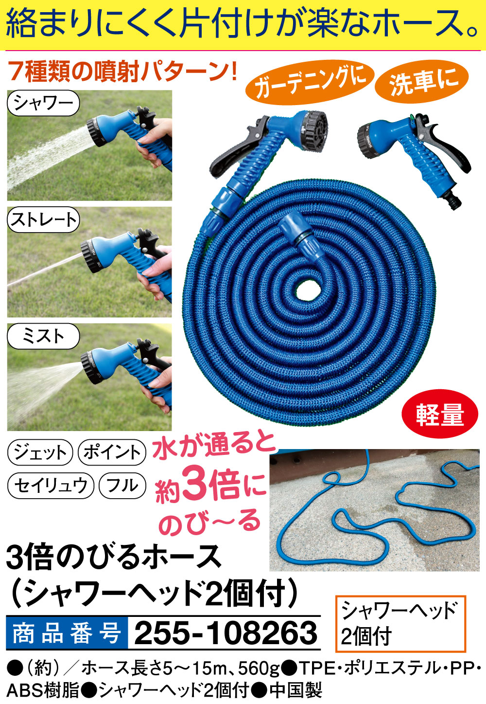 片付けが楽!絡まりにくい!蛇口をひねると約3倍に伸びるホース! 水が通ると約3倍にのび~る! ガーデニングに、洗車に 7種類噴射パターン! ・シャワー ・ストレート ・ミスト ・ジェット ・ポイント ・セイリュウ ・フル ●軽量 ●シャワーヘッド2個付
