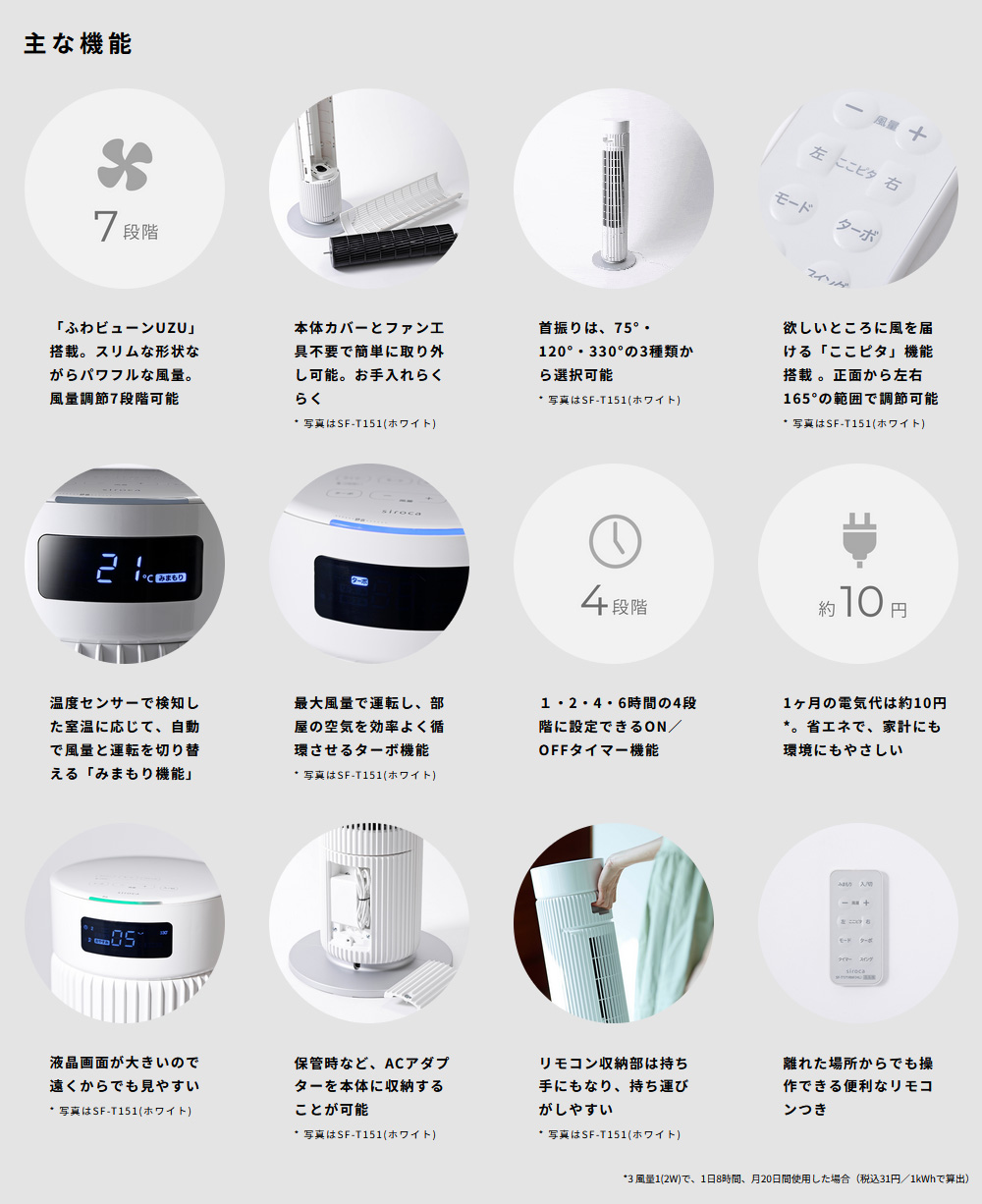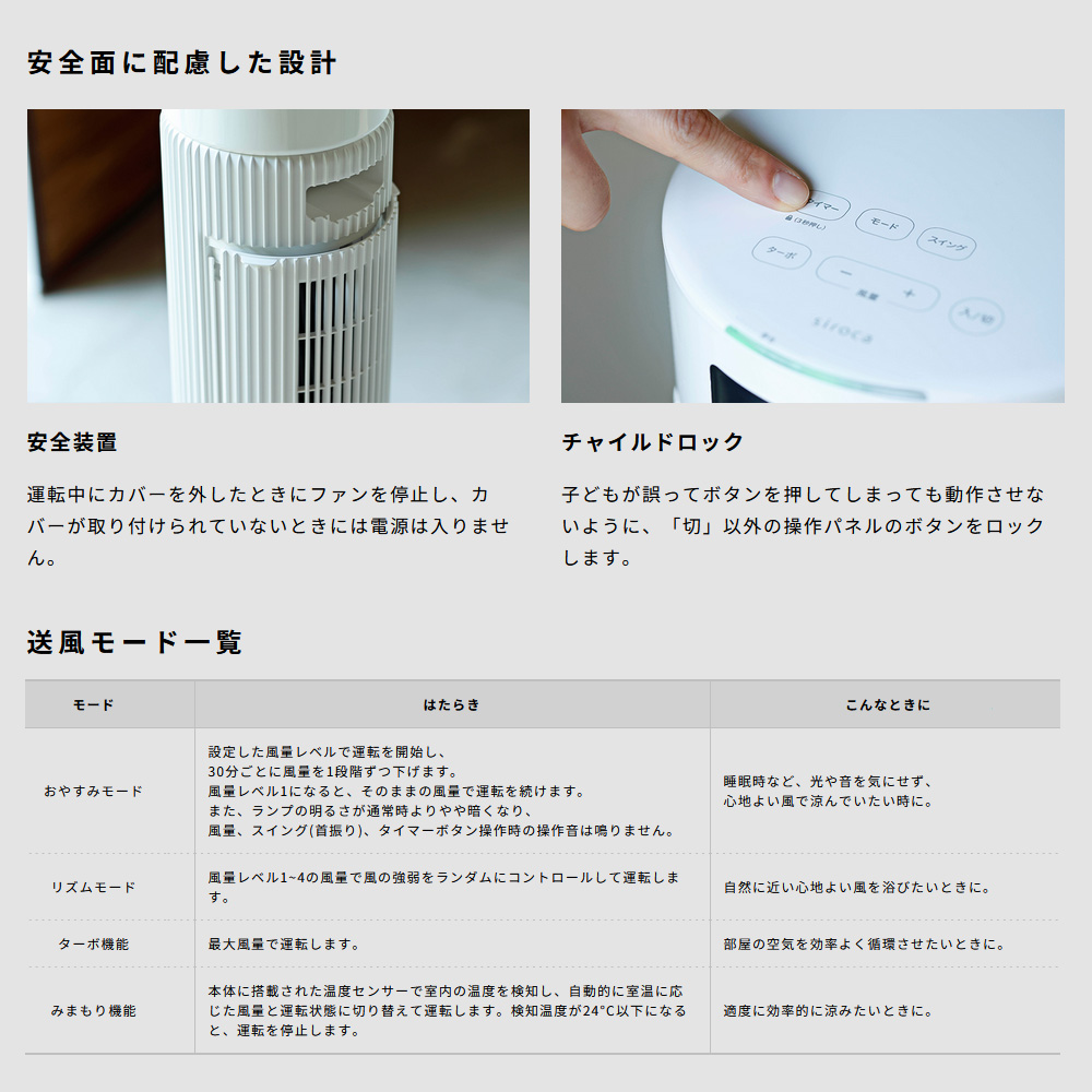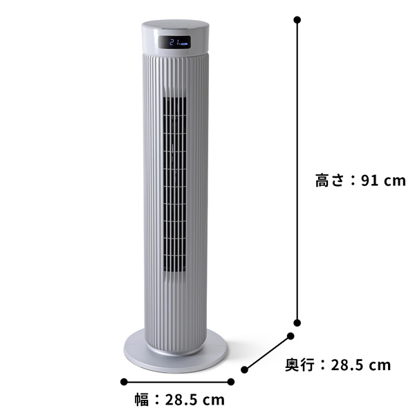 【外形寸法(約)】幅28.5×奥行28.5×高さ91cm 【本体質量(約)】4.4kg 【電源】交流100 V、50/60 Hz 【消費電力】43W 【コード長(約)】1.8m 【モード】送風、リズム、おやすみ、みまもり、ターボ 【セット内容】本体、ACアダプター、リモコン(テスト電池付き)、取扱説明書(保証書)