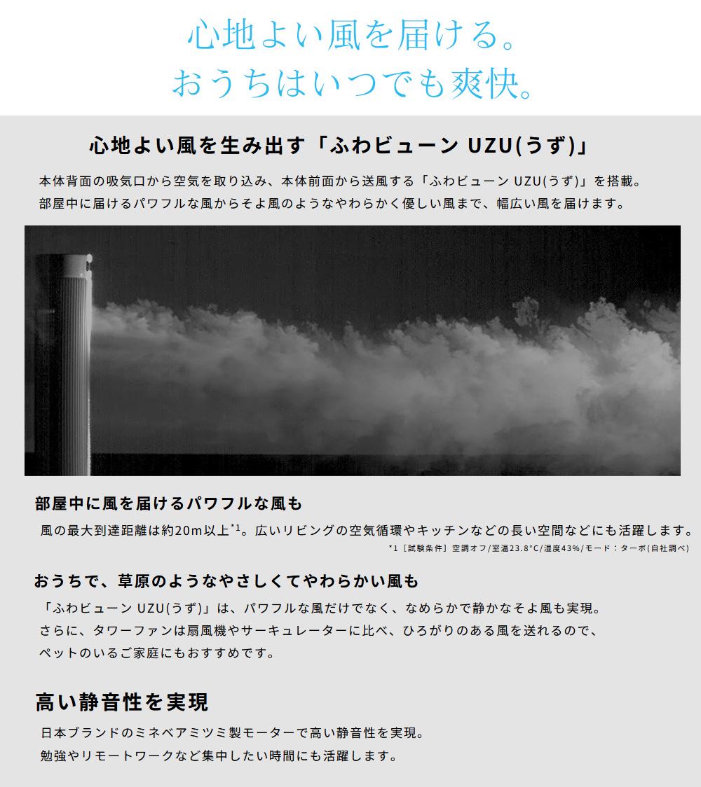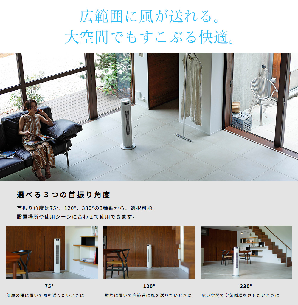 部屋中に届けるパワフルな風から、そよ風のようなやわらかくてやさしい風まで。独自技術の「ふわビューンUZU」搭載。 風の最大到達距離は約20m以上!※ 広いリビングの空気循環やキッチンなどの長い空間などにも活躍します。 (※試験条件:空調オフ/室温23.8℃/湿度43%/ターボモード メーカー調べ) サッと外して丸洗い。 ファンも取り外して洗えるので、お手入れはとっても簡単。 最大で330°の首振り。広い部屋でも隅々まで。 首振り角度は75°、120°、330°の3種類。