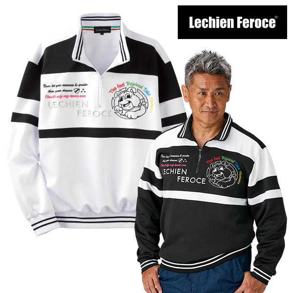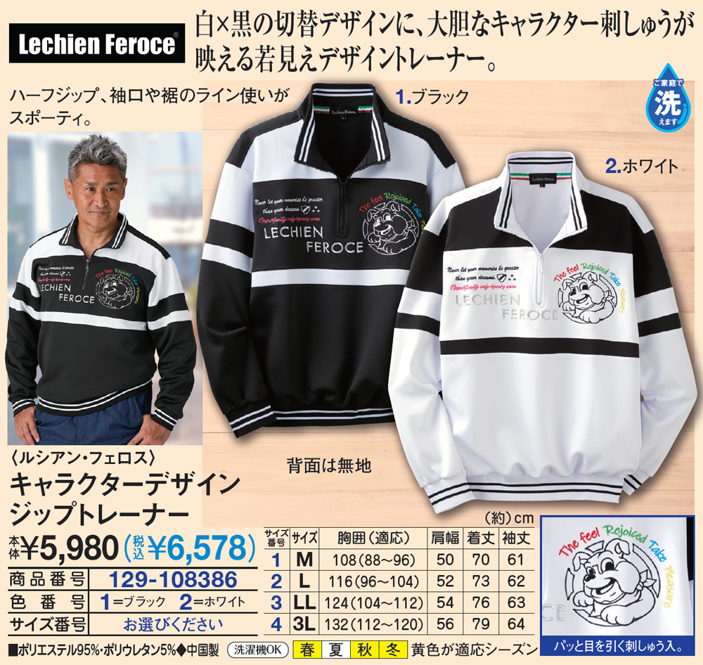 白×黒の切替デザインに、大胆なキャラクター刺しゅうが映える若見えデザイントレーナー! ハーフジップ、袖口や裾のライン使いがスポーティ。 パッと目を引く刺しゅう入。 背面は無地