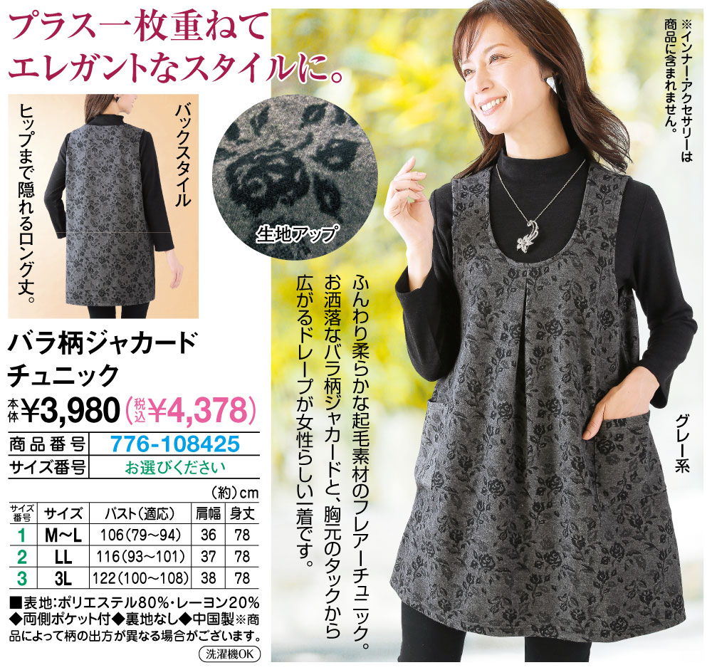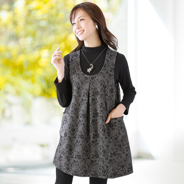 プラス一枚重ねてエレガントなスタイルに! ふんわり柔らかな起毛素材のフレアーチュニック。 お洒落なバラ柄ジャカードと、胸元のタックから広がるドレープが女性らしい一着です。 ヒップまで隠れるロング丈。