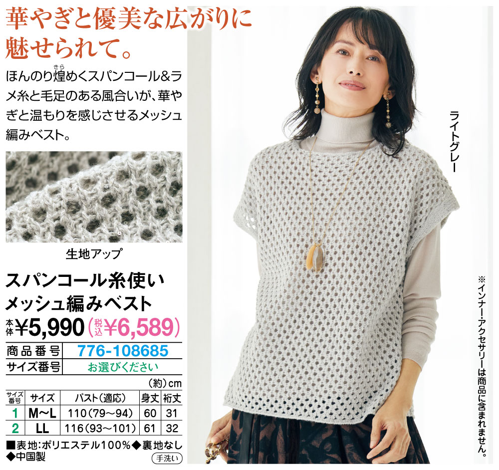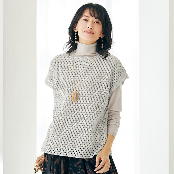 華やぎと優美な広がりに魅せられて! ほんのり煌めくスパンコール&ラメ糸と毛足のある風合いが、華やぎと温もりを感じさせるメッシュ編みベスト。