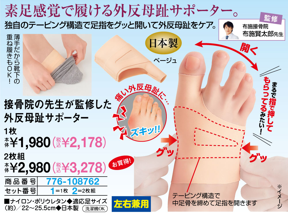 独自のテーピング構造で足指をグッと開いて外反母趾をケア。