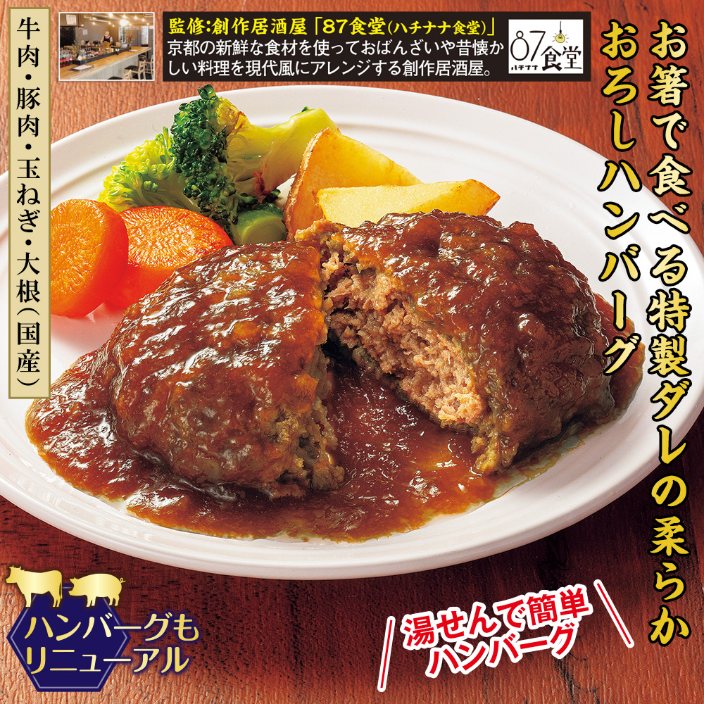 【牛肉・豚肉・玉ねぎ・大根(国産)】 北海道産を中心とした国産牛肉と、国産の豚肉を使用。牛肉に塩味をつけ、余分な水分と脂を抜き、柔らかく食感のあるハンバーグに仕上げました。 ハンバーグもリニューアル。 監修:創作居酒屋「87食堂(ハチナナ食堂)」 京都の新鮮な食材を使っておばんざいや昔懐かしい料理を現代風にアレンジする創作居酒屋。