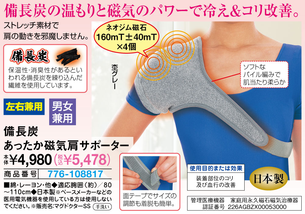 備長炭の温もりと磁気のパワーで冷え&コリ改善! ストレッチ素材で肩の動きを邪魔しません。 ソフトなパイル編みで肌当たり柔らか 面テープでサイズの調節も着脱も簡単。 ●ネオジム磁石160mT±40mT×4個 【備長炭】 保温性・消臭性があるといわれる備長炭を練り込んだ繊維を使用しています。 管理医療機器:家庭用永久磁石磁気治療器 ◆認証番号:226AGBZX00053000 【使用目的または効果】 装着部位のコリ及び血行の改善 ●左右兼用 ●男女兼用