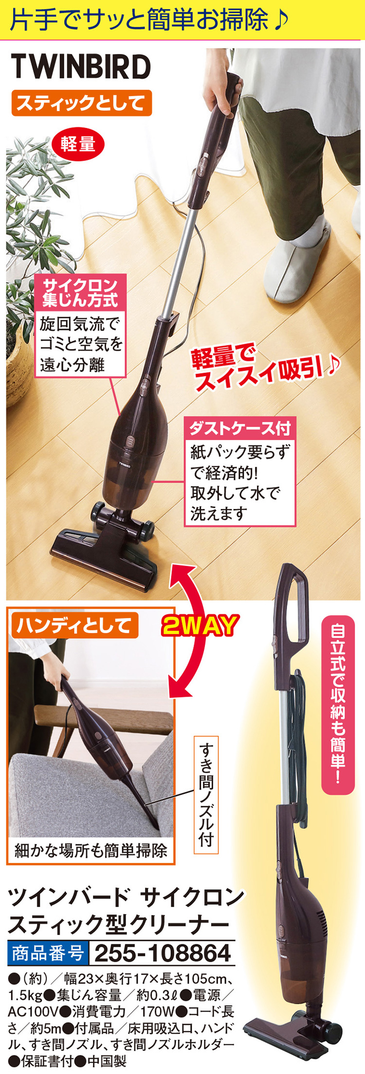 ●(約)/幅23×奥行17×長さ105cm、1.5kg ●集じん容量/約0.3L ●電源/AC100V ●消費電力/170W ●コード長さ/約5m ●付属品/床用吸込口、ハンドル、すき間ノズル、すき間ノズルホルダー ●保証書付 ●中国製