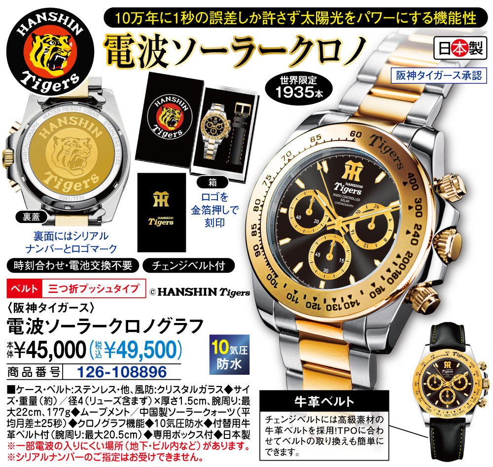 ●サイズ(約):径4(リューズ含まず)×厚さ1.5cm/適応手首周り(最大)=22cm ●重量(約):177g ●素材:ケース・ベルト=ステンレス、他/風防=クリスタルガラス ●仕様:中国製クォーツムーブメント、平均月差±25秒(電波非受信時)、光発電方式(パワーセーブ作動時フル充電より約6カ月稼働)、10気圧防水、1/1秒クロノグラフ(60秒計、60分計) ●クロノグラフ機能 ●付属品:牛革チェンジベルト(適応手首周り最20.5cm)、専用BOX ●留め具:三つ折れプッシュ式 ●日本製