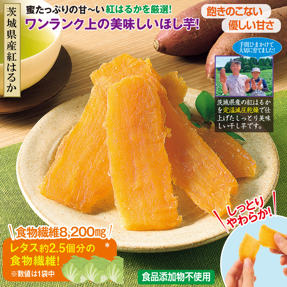 【茨城県産紅はるか】 蜜たっぷりの甘~い紅はるかを厳選! 飽きのこない優しい甘さ。 さつまいもの名産地茨城県産の紅はるかを使用した干し芋。 飽きのこない優しい自然な甘さをお楽しみいただけます。 お茶請けや小腹が空いた時におすすめです。 食品添加物不使用。 食物繊維8,200mg レタス約2.5個分の食物繊維! ※数値は1袋中