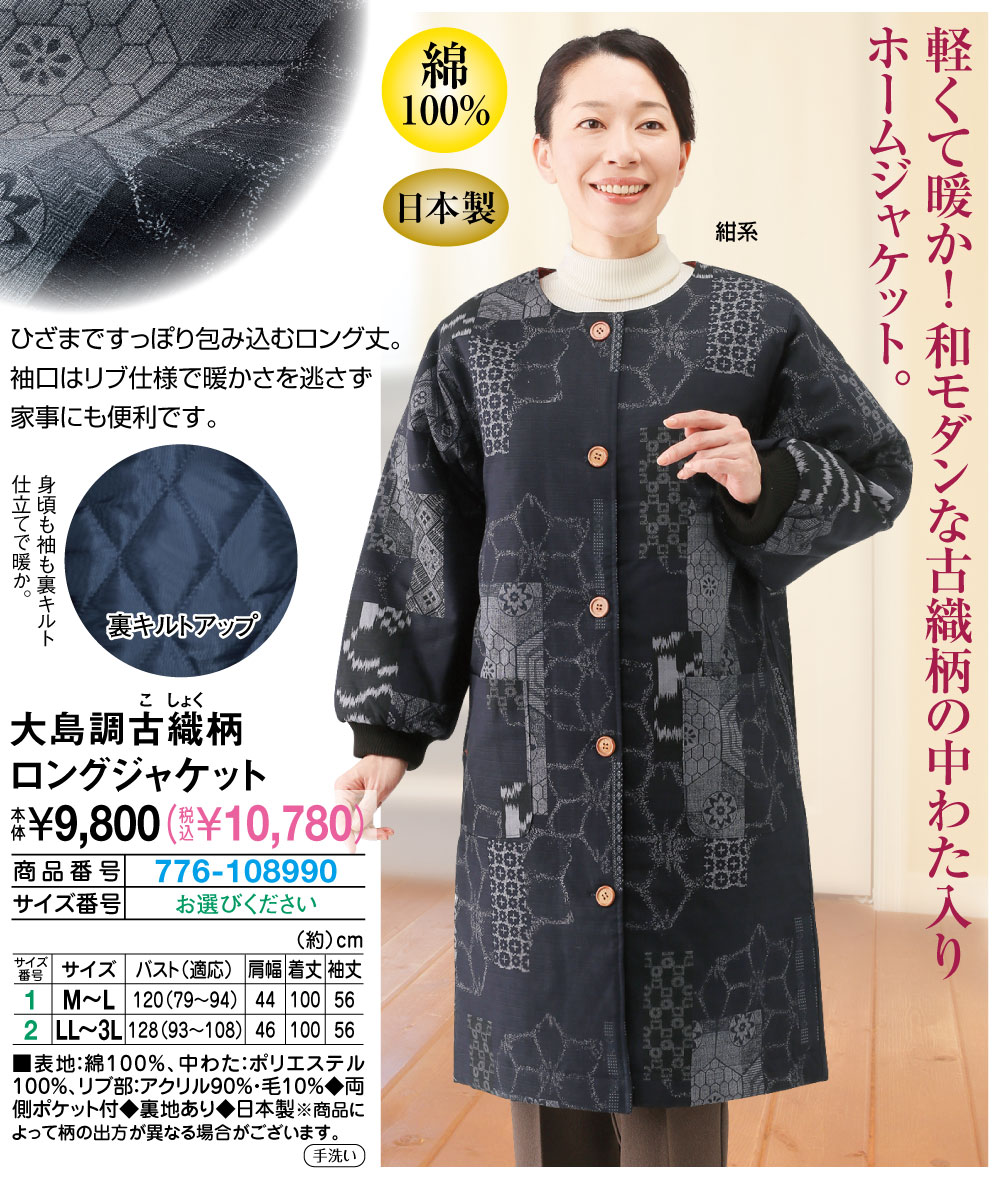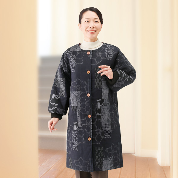 軽くて暖か!和モダンな古織柄の中わた入りホームジャケット! ひざまですっぽり包み込むロング丈。 袖口はリブ仕様で暖かさを逃さず家事にも便利です。 身頃も袖も裏キルト仕立てで暖か。