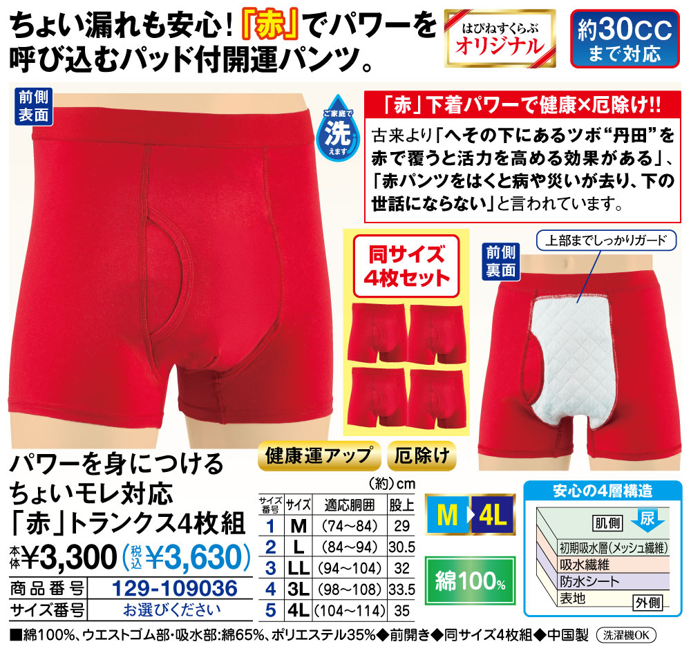 赤い下着でパワーを呼び込む!吸水機能も備えた開運パンツ! 【「赤」下着パワーで健康×厄除け!!】 古来よりへその下にあるツボ「丹田」を赤で覆うと活力を高める効果があると言われています。また、赤パンツをはくと病や災いが去り、下の世話にならないと言われています。 ・吸水機能 ・健康運アップ ・開運 ・厄除け 上部までしっかりガード 【安心の4層構造】 <肌側>初期吸水層(メッシュ繊維)/吸水繊維/防水シート/表地<外側> ●綿100% ●約30CCまで対応 ●同サイズ4枚セット ●5サイズ展開!!M~4L