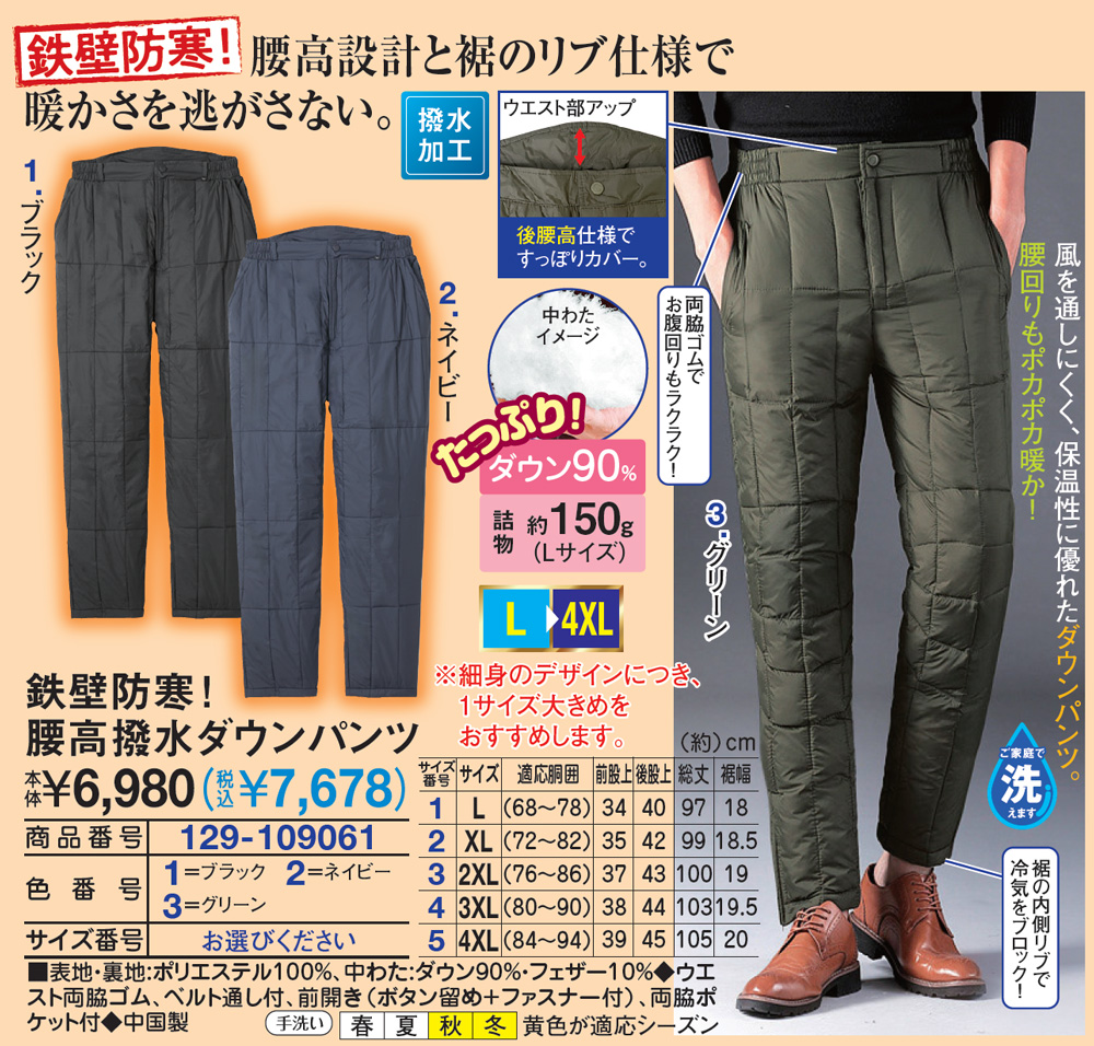 鉄壁防寒!腰高設計と裾のリブ仕様で暖かさを逃がさない! 風を通しにくく、保温性に優れたダウンパンツ。腰回りもポカポカ暖か! 両脇ゴムでお腹回りもラクラク! 裾の内側リブで冷気をブロック! 後腰高仕様ですっぽりカバー。 たっぷり!ダウン90%詰物約150g(Lサイズ) ●撥水加工 ●L~4XL