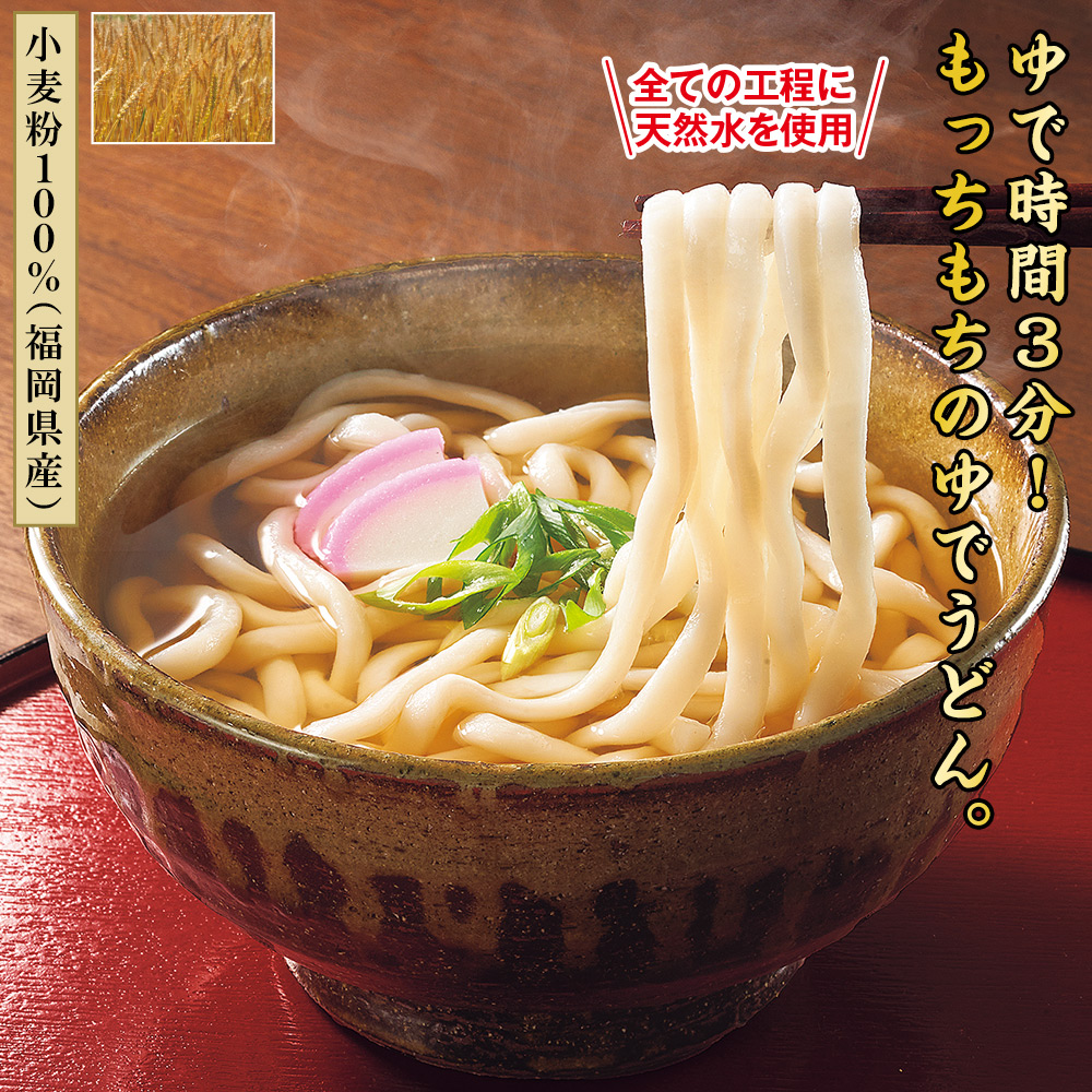 【小麦粉100%(福岡県産)】 ゆで時間3分!もっちもちのゆでうどん。 全ての工程に天然水を使用。