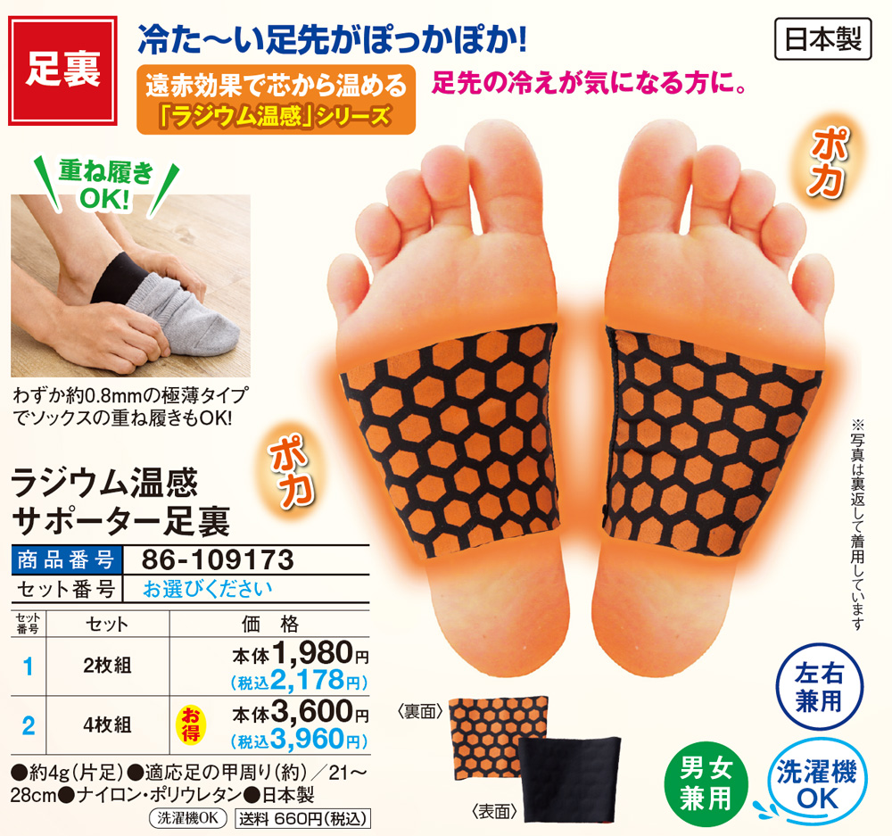 冷た~い足先がぽっかぽか! 【裏足】 ピンポイントで冷え対策! 遠赤効果で芯から温める「ラジウム温感」シリーズ 足先の冷えが気になる方に。 わずか約0.8mmの極薄タイプでソックスの重ね履きもOK! ●重ね履きOK ●左右兼用 ●男女兼用