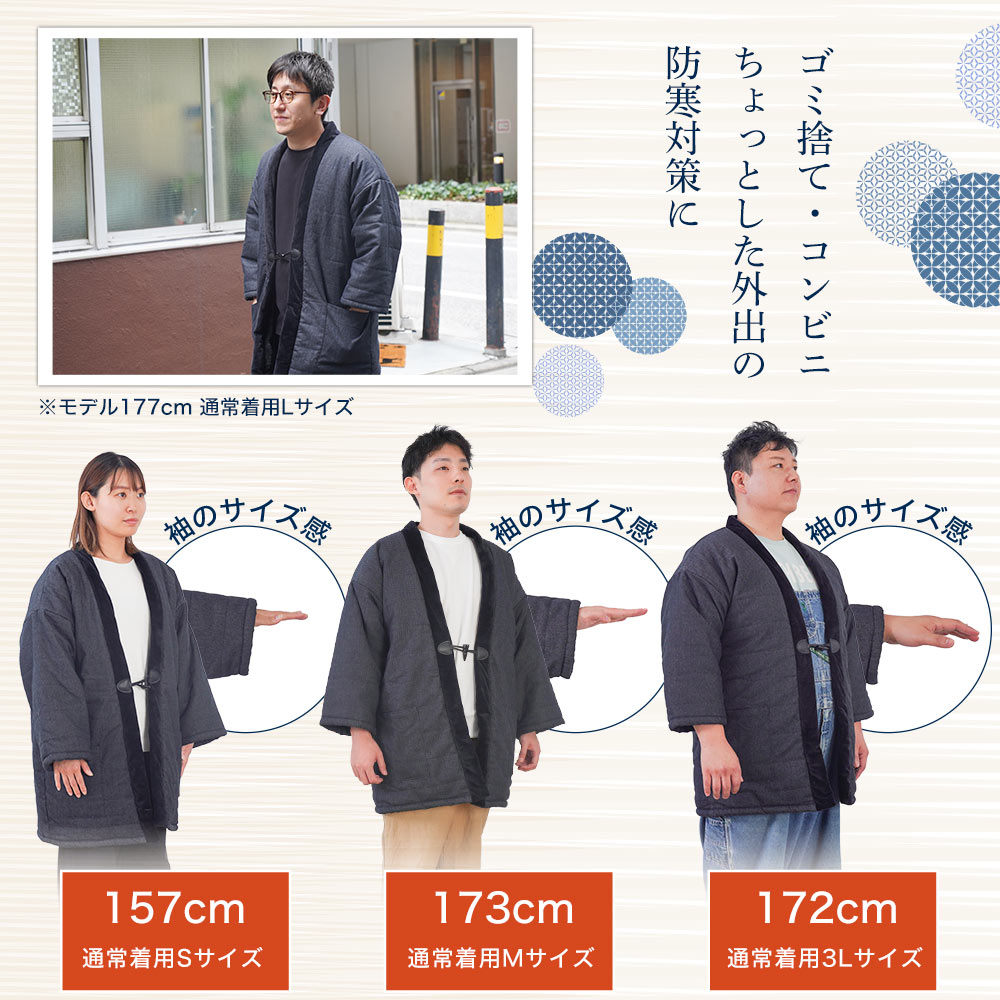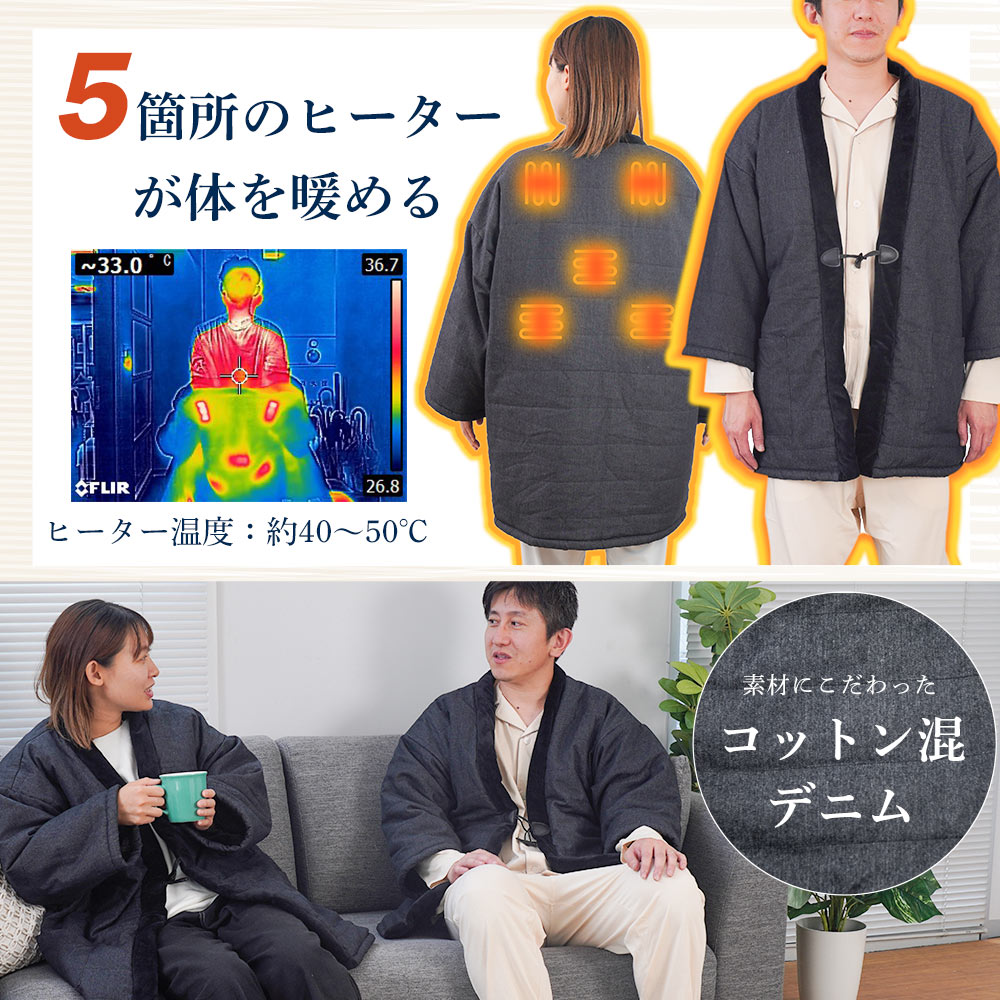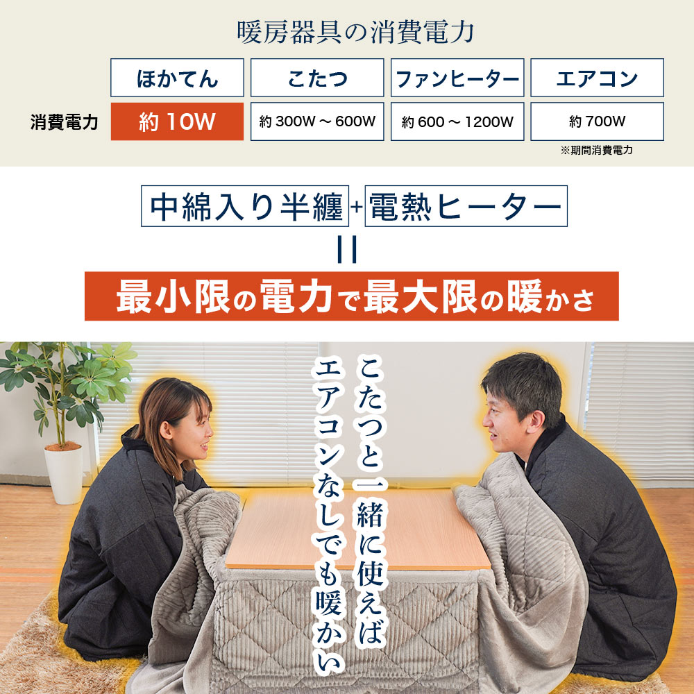 寒さにも電気代の高騰にも負けない、電熱ヒーター入りの半纏「ほかてん」。 羽織るだけで温かい半纏の良さと、最新の電熱ヒーターの融合で、最高に快適な防寒着が完成。 首回りから腰のあたりまでフワッと暖かく包み込んで、薄着でもポカポカと暖めてくれます。 内蔵の電熱ヒーターはUSB駆動、3段階で温度の調整が可能。 お手持ちのUSBモバイルバッテリーを使用でき、ケーブルレスで使えます。 ※モバイルバッテリーは付属しません。