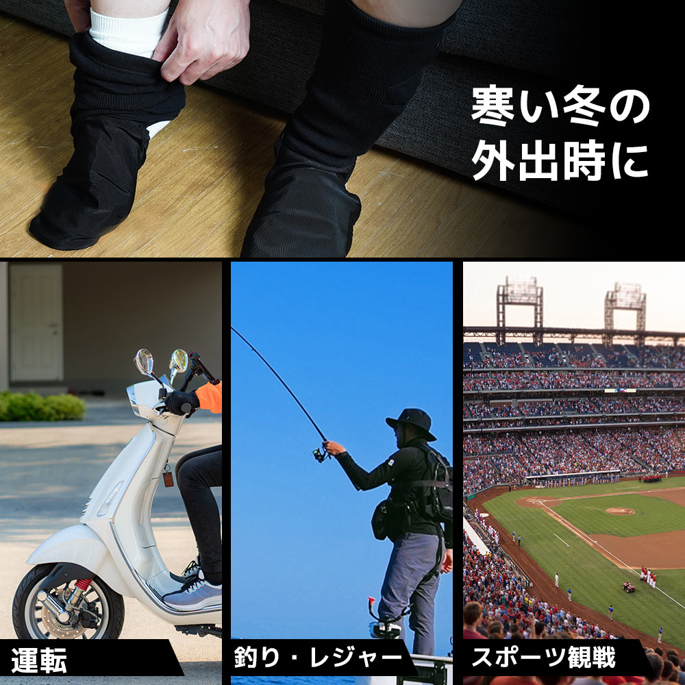 靴下の上に重ねて履けば、足の甲部分のヒーターが足を暖めてくれます。 超薄型で、重ね履きでもごわつかないハイソックスタイプのヒーター靴下です。 靴の中はしっかりと暖かく、足底部分はメッシュ構造で蒸れにくい構造になっています。 冬のバイク運転、キャンプやスポーツ観戦など、真冬の屋外活動時に大活躍! 内蔵のヒーターはUSB駆動、3段階で温度の調整が可能。 バッテリーポケットがあり、ケーブルレスで履くことができます。 ※モバイルバッテリーは付属しません。お手持ちのUSBモバイルバッテリーをご使用ください。 足のサイズ24~30cmまで対応します。 洗濯機洗いOK。