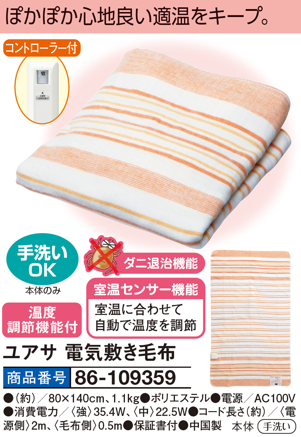 ●(約)/80×140cm、1.1kg ●ポリエステル ●電源/AC100V ●消費電力/<強>35.4W、<中>22.5W ●コード長さ(約)/<電源側>2m、<毛布側>0.5m ●保証書付 ●中国製